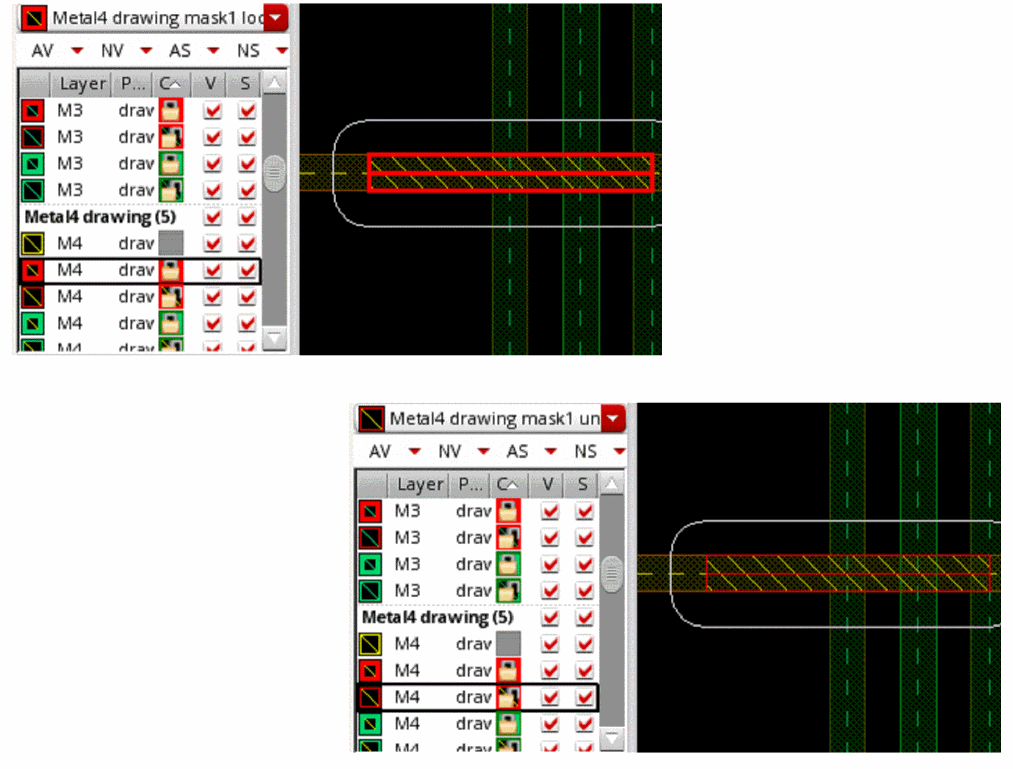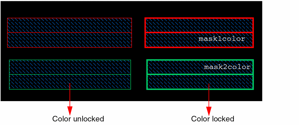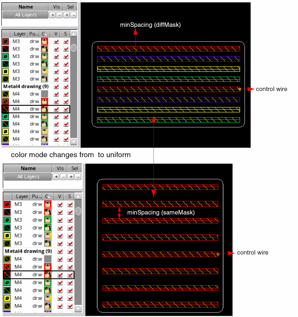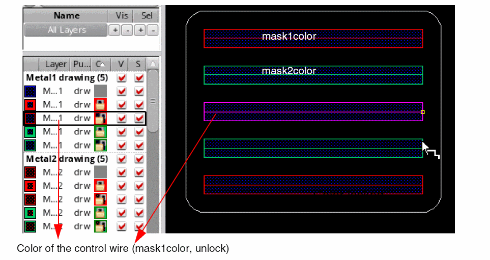 Let us consider an example where the active layer-purpose pair is Metal4 Drawing and the control wire is assigned mask1Color. The highest available mask color for Metal4 Drawing is mask4Color.
