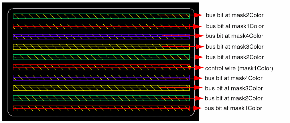 maskColor(controlWire)-1,maskColor(contorlWire)-2, and so on. If the control wire has the lowest available mask color assigned to it, then the bus bits below the control wire are colored starting with the highest mask color available for the layer on which the bus is being placed. The pattern is then repeated for the remaining bus bits.