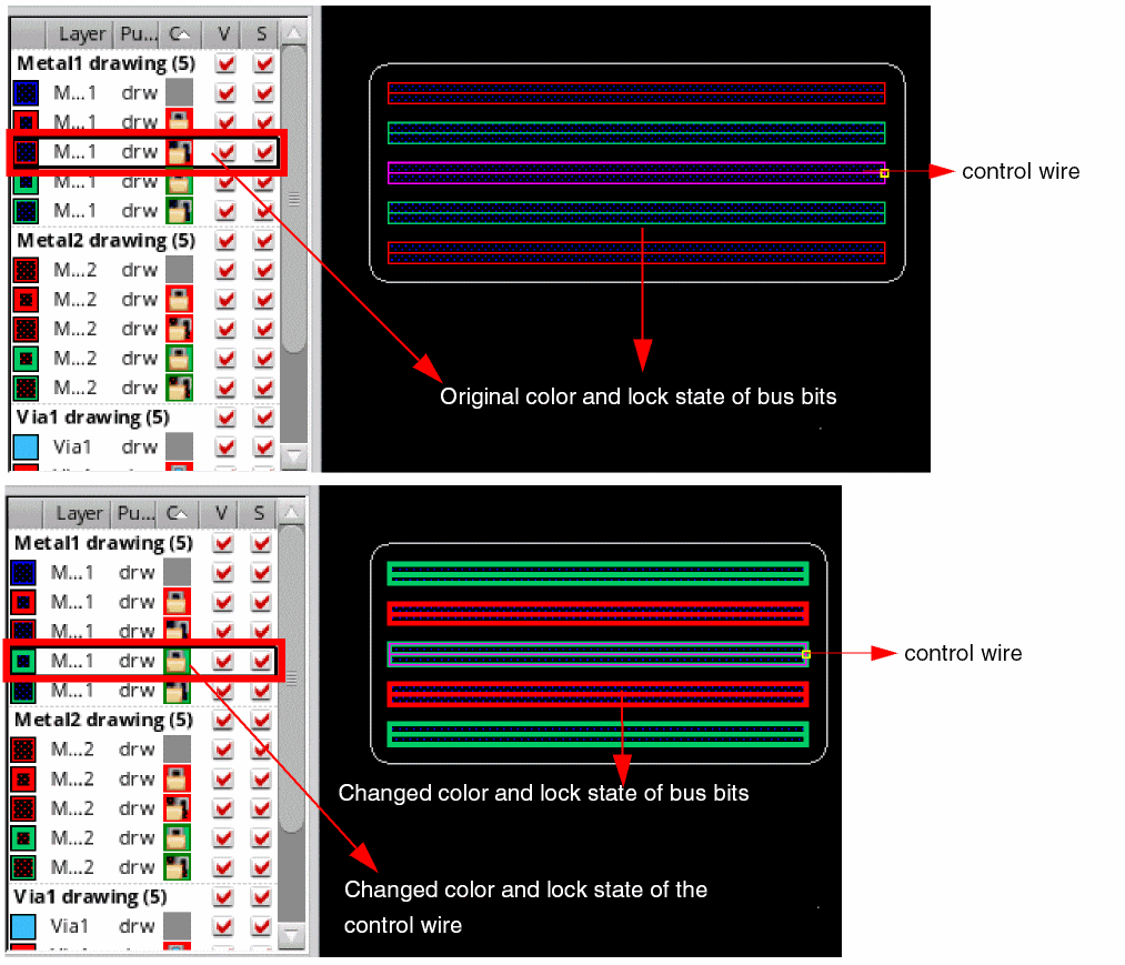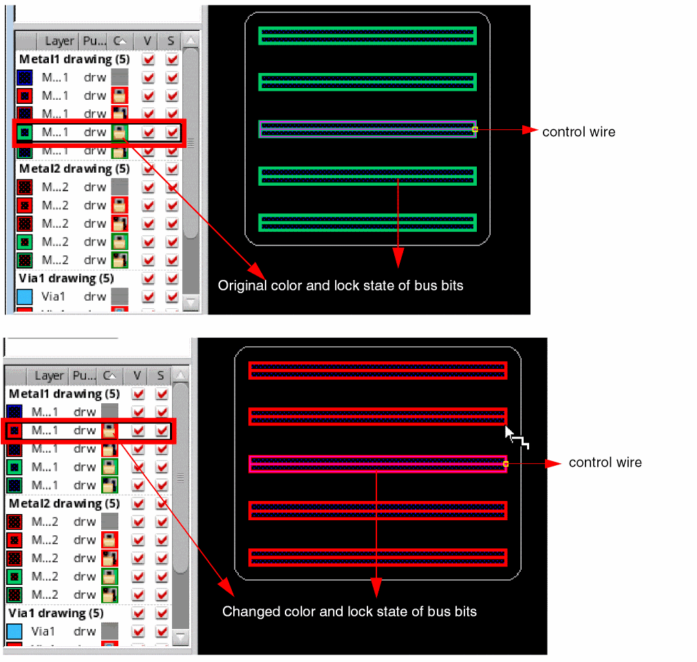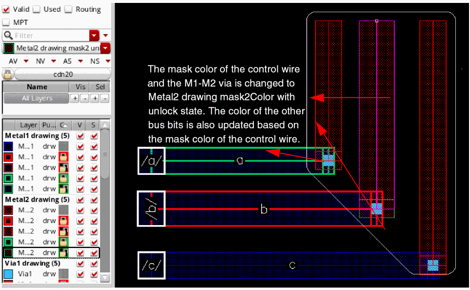 To change the mask color of the control wire and other bus bits, select another layer-purpose pair with a different mask color from the Palette.