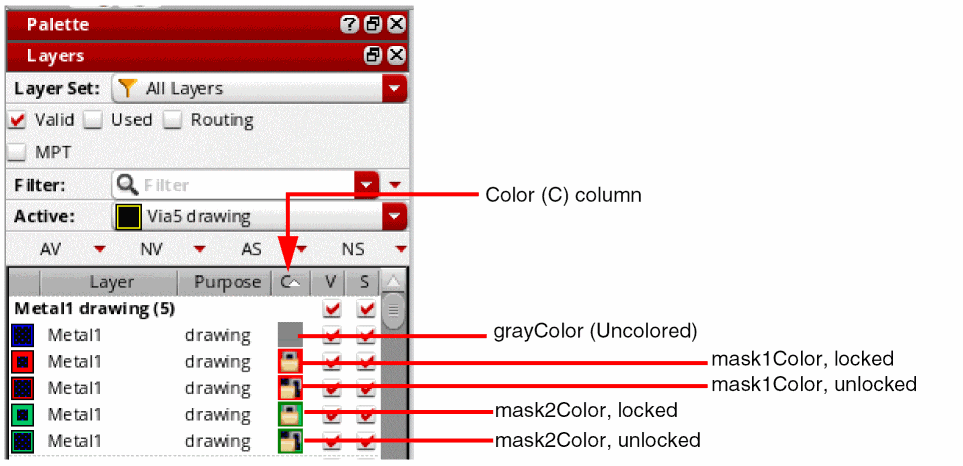 Notice that the icons listed in the Color (C) column for each layer-purpose pair provide color as well as lock information.