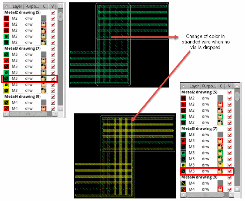 When the color mode changes from optimized to uniform and the blockage with net name A exists on the Metal3 layer. The stranded wire is created from an empty space on Metal2 layer and changes the direction by inserting vias.