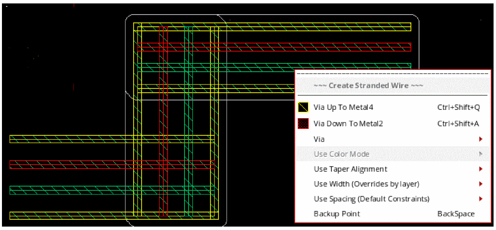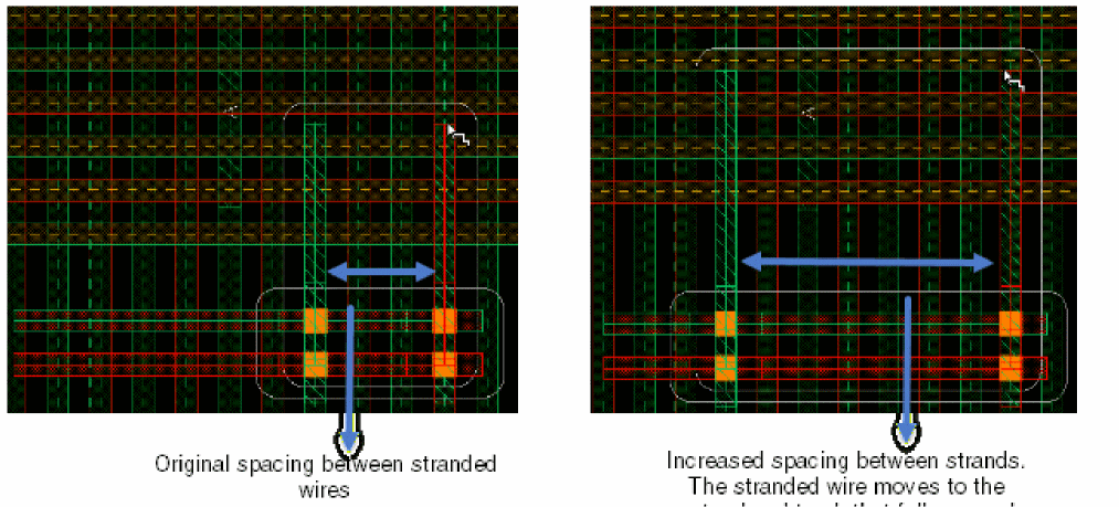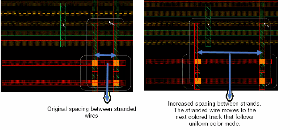 The following figure displays the stranded wire when the color mode is changed to optimized. The stranded wire inherits the nearest track spacing.