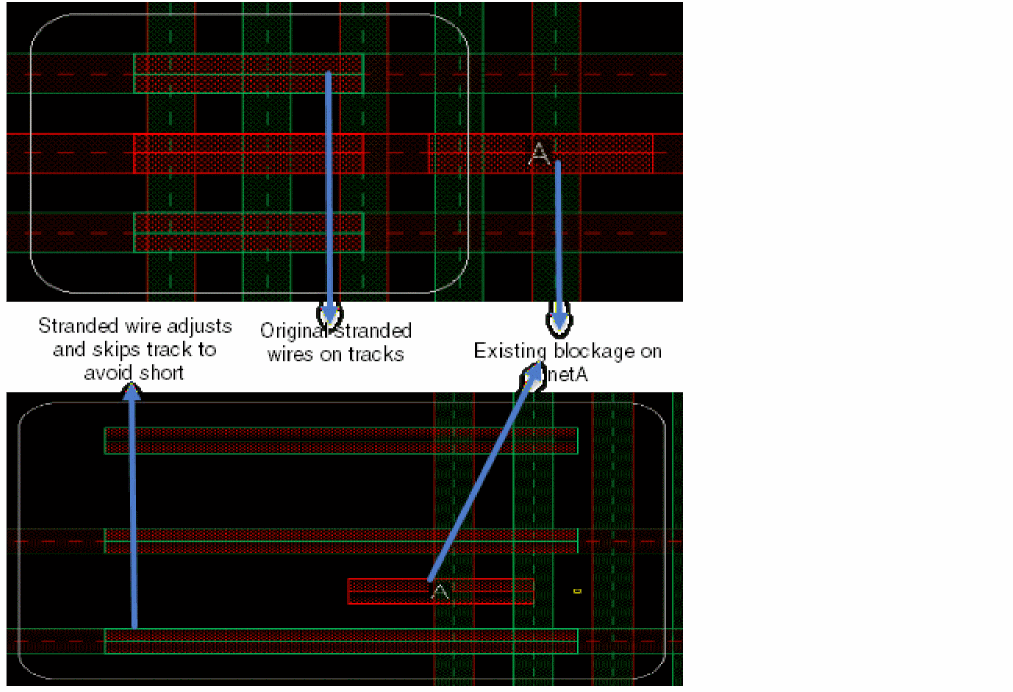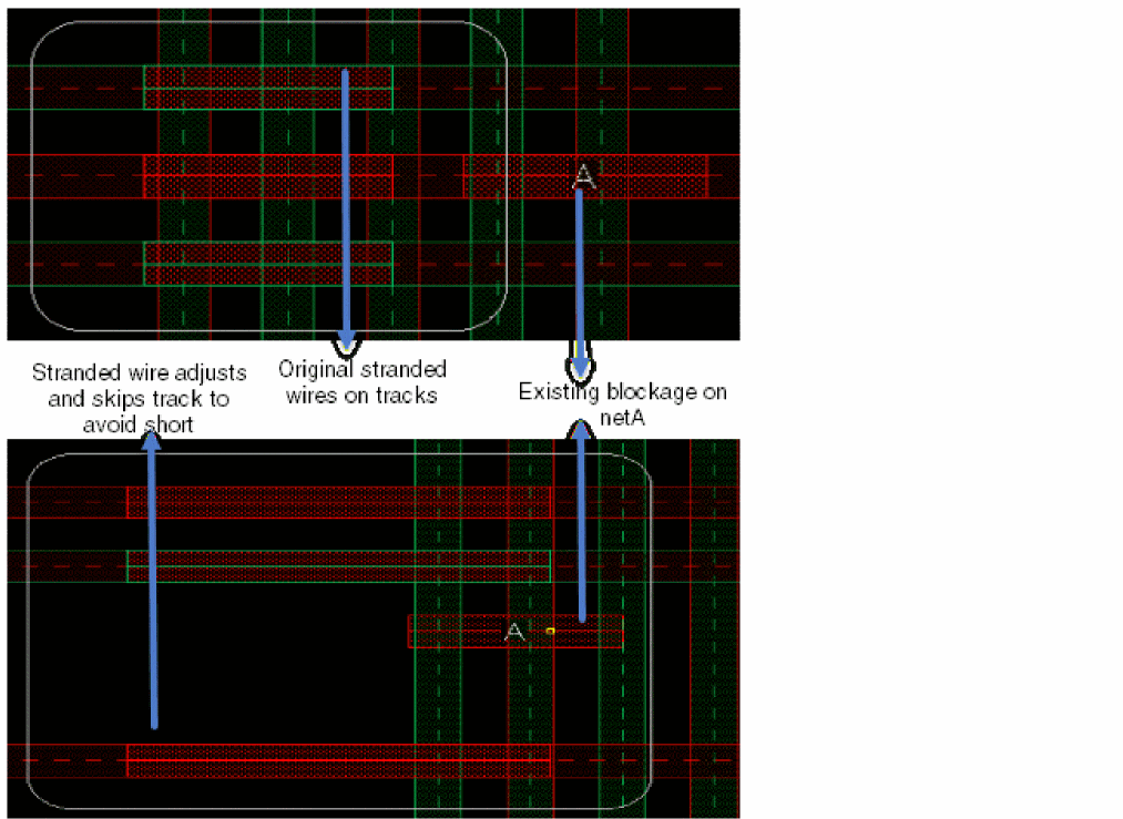 This section illustrates some of the possible scenarios, with different requirements, on how a stranded wire skips the track on which a blockage appears and accordingly adjusts to the next nearest track that does not have any blockage when MPT is enabled and stranded wires are colored.