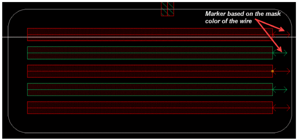 When the Create Wire, Create Stranded Wire, or the Create Bus command is run, a white halo surrounding the active wires displays. This halo determines minSpacing, minEndOfLineSpacing, and some other violations. In order to show the samemask spacing for mask1, mask2, and mask3 separately, additional markers appear according to the mask color of the wire. If the wire is of mask1 color, a mask1 arrow appears at the end of active wire. Similarly, if the wire is of mask2 or mask3 color, a mask2 or a mask3 arrow appear sat the end of the active wire. The existing white halo determines the spacing for different mask colors. The following figure shows an example when a bus is created on the Metal2 layer, which is in the horizontal direction.