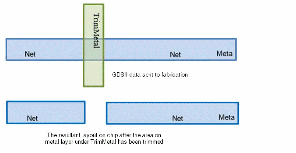 TrimMetal is a physical layer where trim shapes are inserted. In some process technologies, these metal layers are used to trim portions of a metal layer. This enables routing with much smaller end-of-line spacing that would otherwise be impossible. This is denoted in the GDSII data that is sent to the fabrication and checked by DRC, as shown in the following figure.