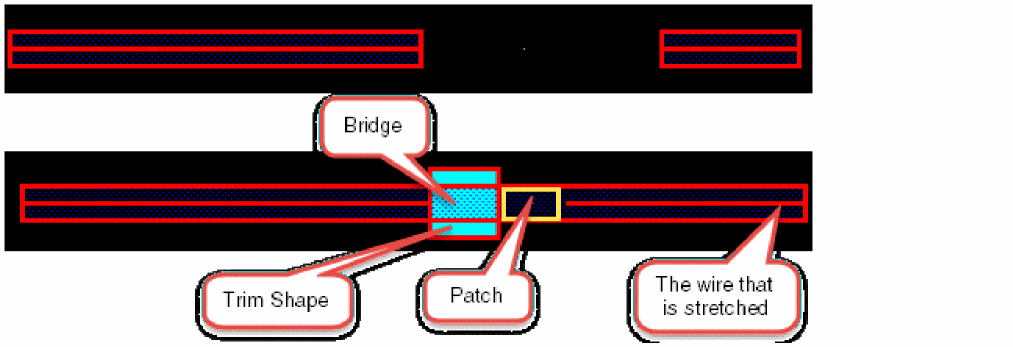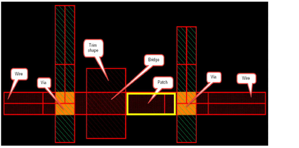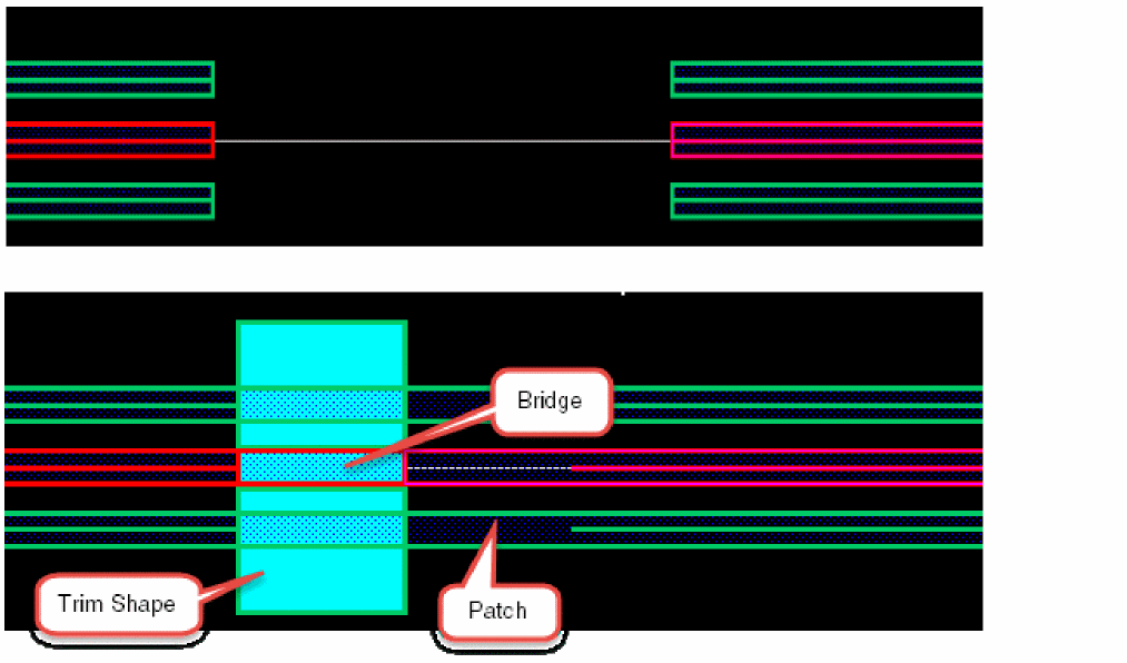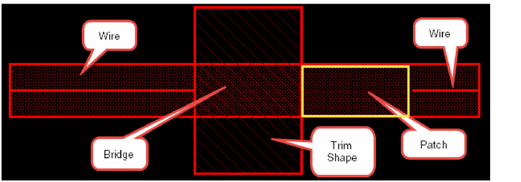 The trim, bridge, and patch shapes are inserted interactively when the wire is created. Under the trim shape, there is a bridge shape on the metal layer. The width of the bridge shape is the same as that of the wire. There is also a patch shape on the metal layer that extends to already existing wires to the trim shape. The patch shape is inserted between the trim shape and the far end of the already existing wire.