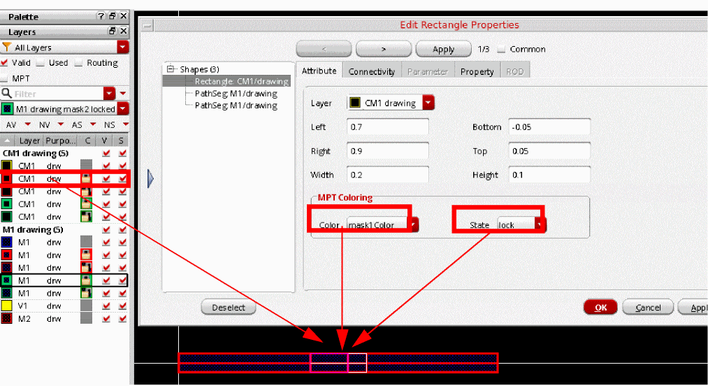 Similarly, after the via has been placed, you can change the color and lock information from the Palette for both the output layer via enclosure and the wire currently being drawn. The following figure shows that the color information of the output layer via enclosure and the new pathSeg on the M3 layer has changed from mask2Color to mask3Color.