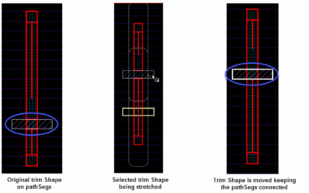 When a trim shape is fully selected and there is only one selected trim shape, the trim insertion is deactivated to allow the Stretch command to move the trim shape and keep the abutted pathSegs connected. This is possible only if the weTrimInsertion environment variable is enabled. The following figure displays how the trim shape keeps the pathSeg connected when the trim shape is selected and stretched.