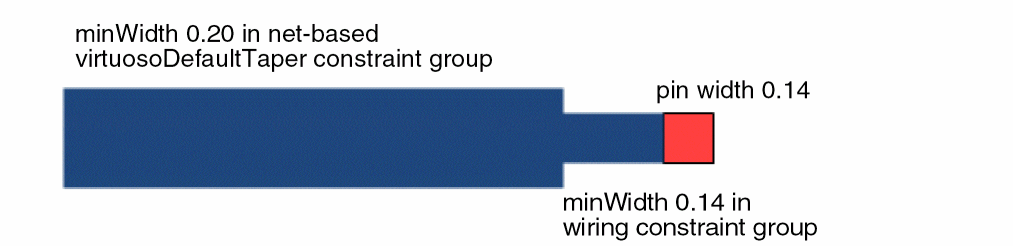 validLayers constraint of the taper constraint group, but some of your nets require a more restricted layer set, use the input and output taper constraint groups to reduce the validLayers list for those specific nets. You can use the Process Rule Editor to assign the validLayers constraint to the input/output taper constraint groups.minWidth defined in that constraint group is greater than the width of the pins, the router may taper down using the minWidth defined in the wire constraint group when connecting to those pins. This optimizes routing for pin connections. The router does not consider the behavior as a violation of the net based constraint group. See the illustration below.