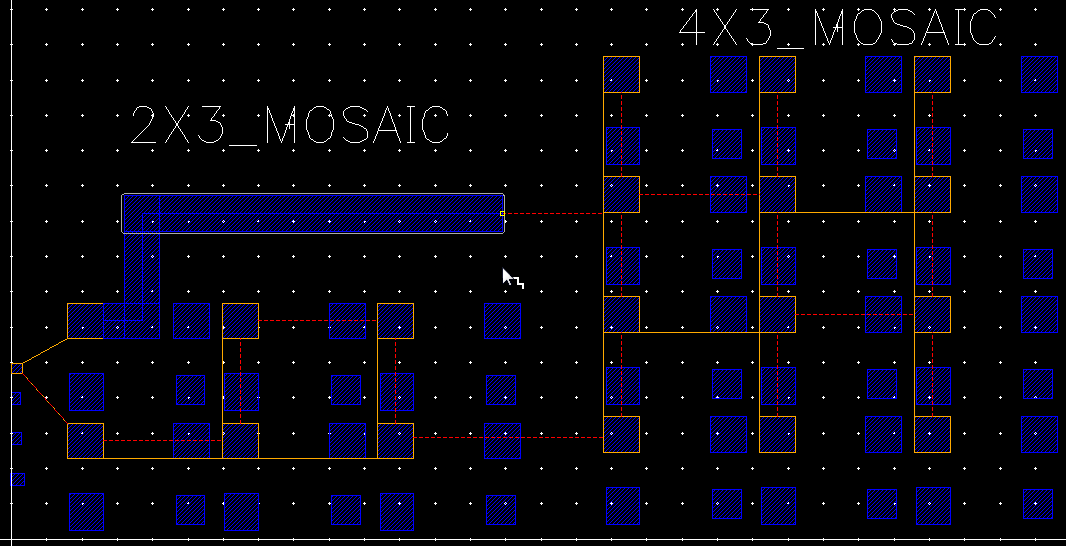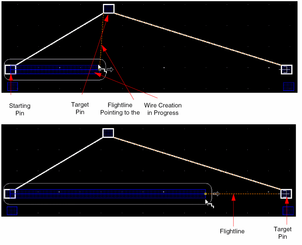 The Create Wire command supports mosaics. When starting a wire from an instance pin of a mosaic, Create Wire can snap automatically to the instance pin of the other mosaic. The following figure shows a wire automatically snapping to an instance pin of a mosaic. You can also see the flightlines while snapping to an instance pin of a mosaic.