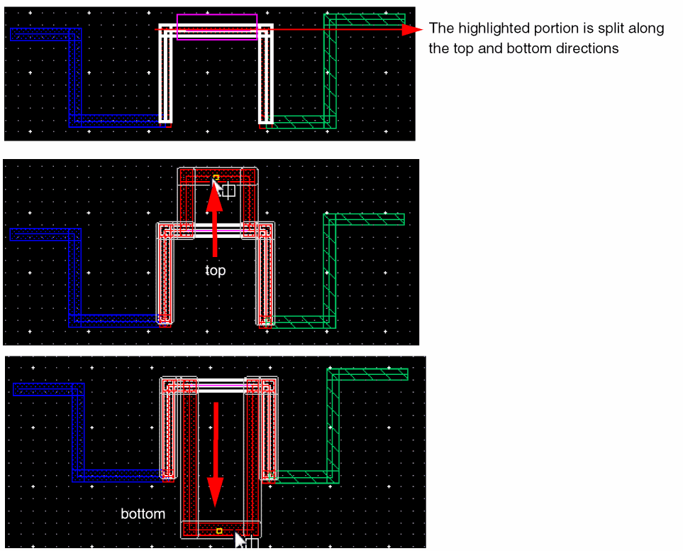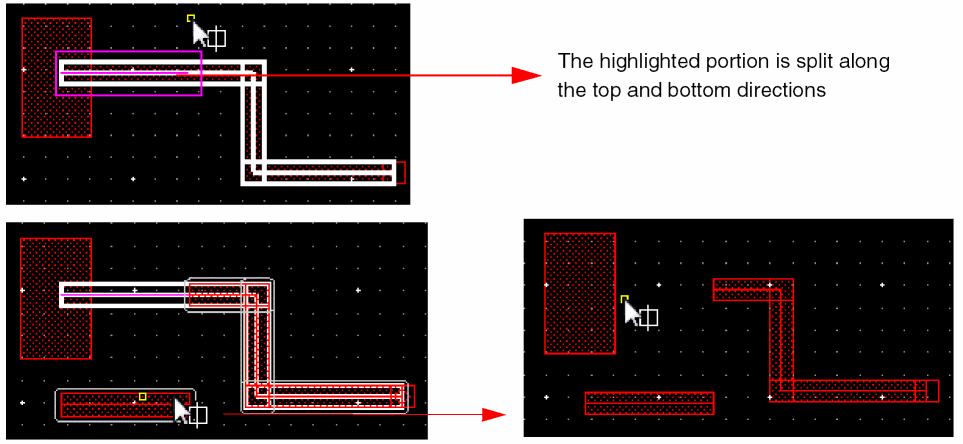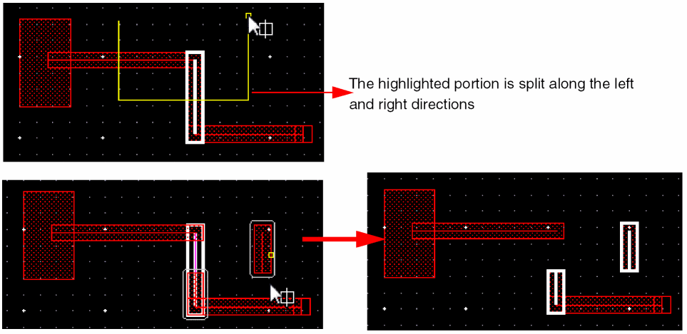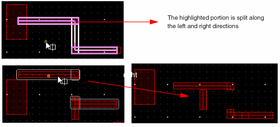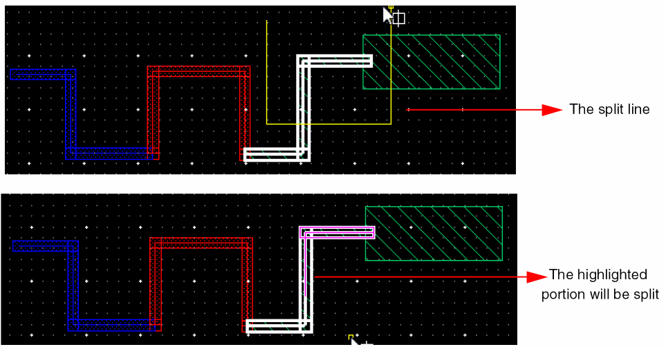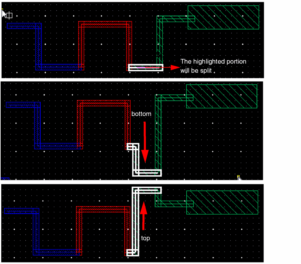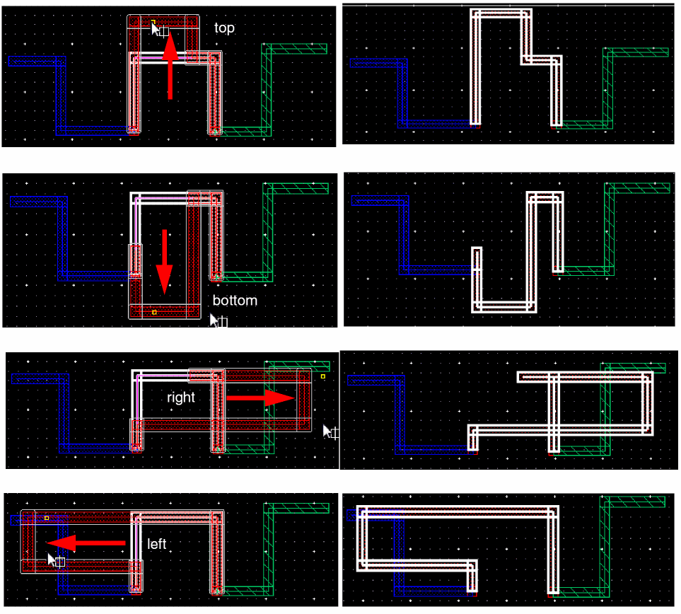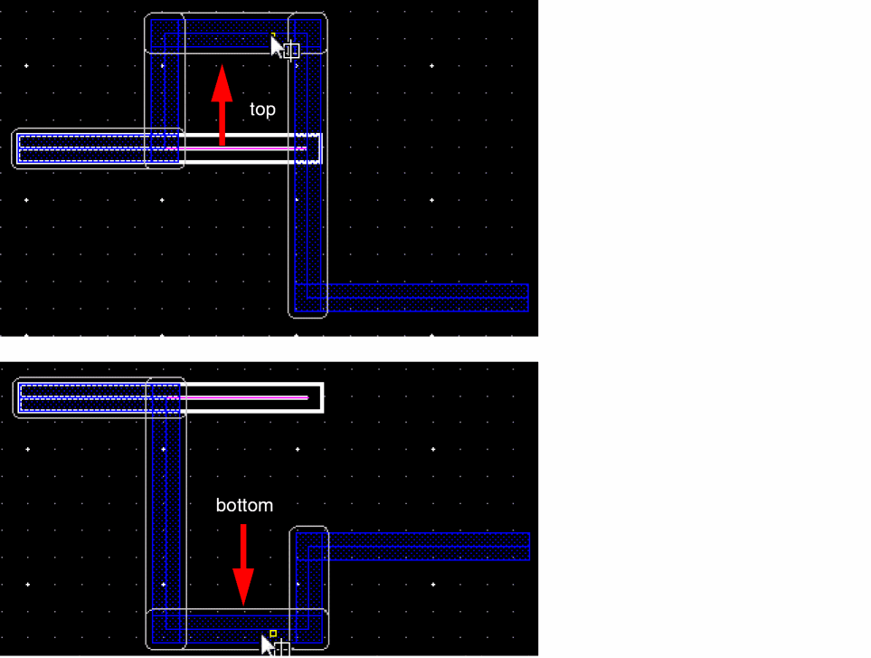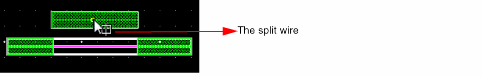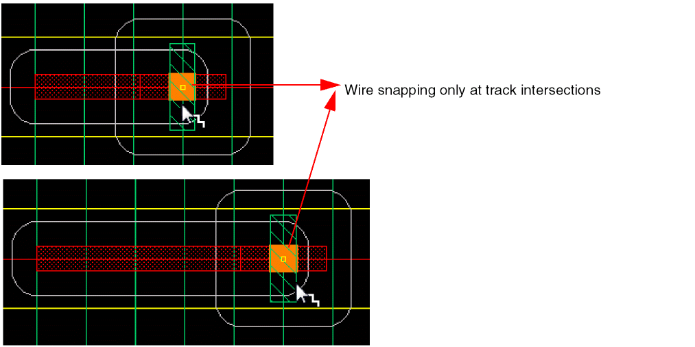 In Wire Editing you can automatically snap a wire to the intersection of existing and crossing wires on the same net. This basically allows you to create local interconnect wires and avoids non-rectangular shape violations and small wire segments creation. The following figure shows an example where two parallel poly wires are connected using LiPO over an already existing crossing Metal1 wire.