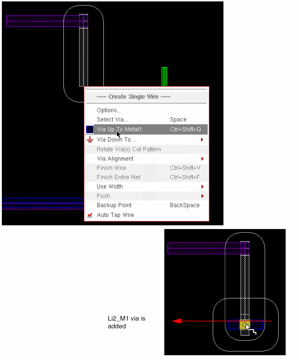 The via origin of the created via is snapped to the center of the wire or pin on the Metal1 layer. When the wire created on the Li layer is dragged across the adjacent layer boundary, the created via disappears and wire creation continues.