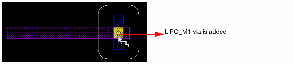 Metal1pin,LiPOlayer is automatically recognized for via construction, as shown in Figure 1 below. The cursor onMetal1pin recognizesLiPO. -