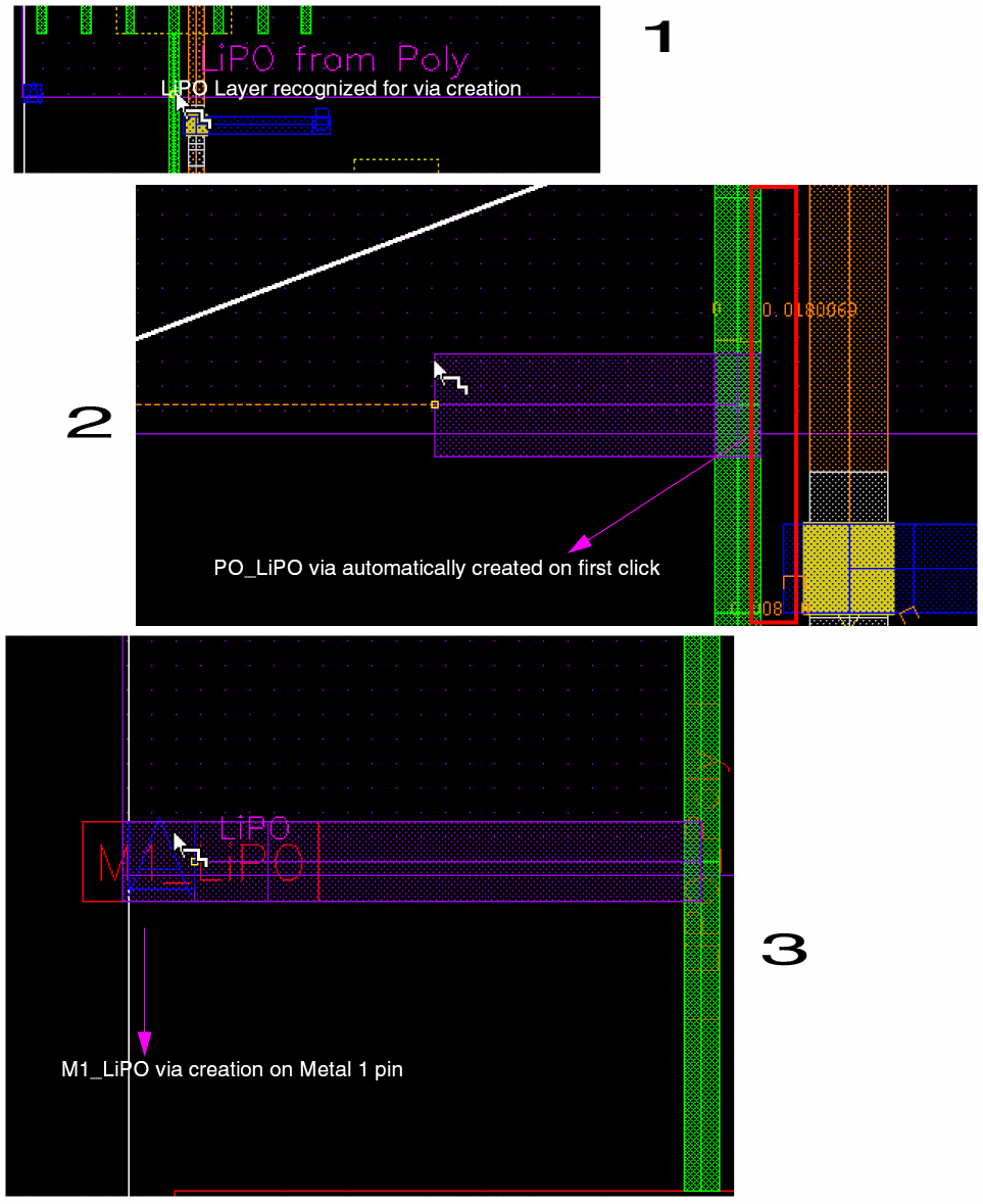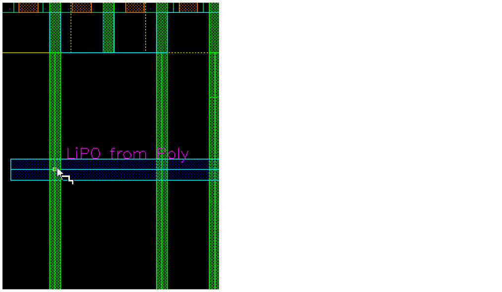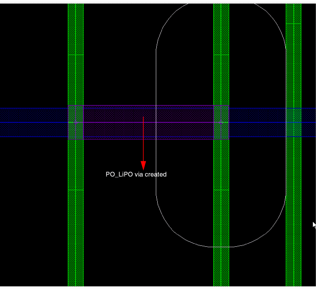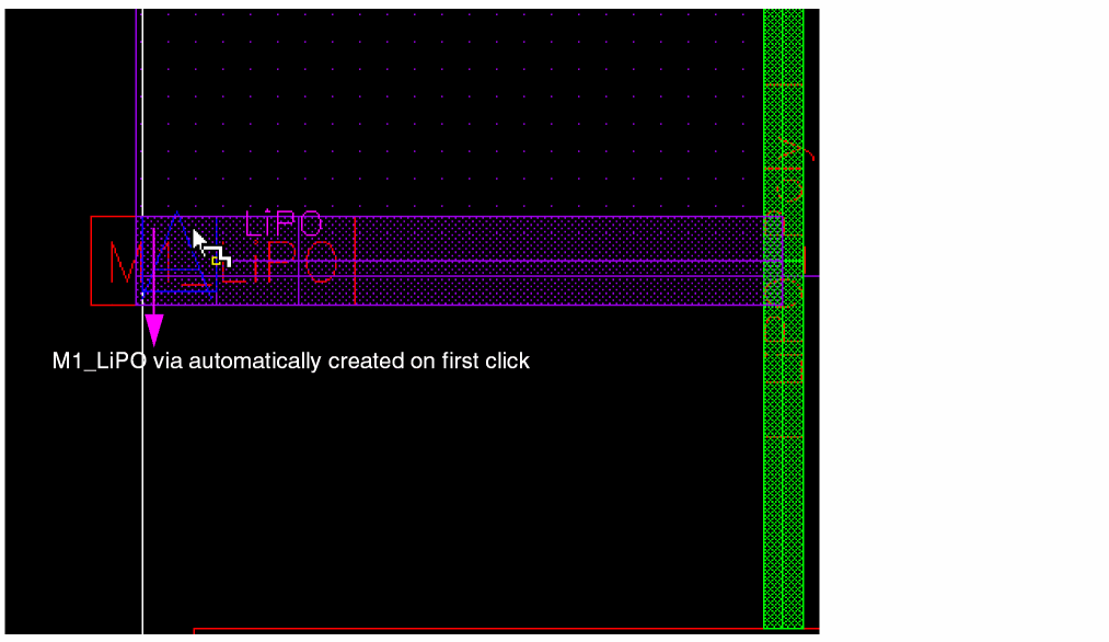 The first click automatically drops a PO_LiPO via at the intersection, preventing any rectShapeDir violation and creation of small PO segments at the intersection. As the LiPO wire is being dragged, Wire Editor automatically adds a LiPO_M1 via as if the connection would terminate on the overlapping Metal1 wire.