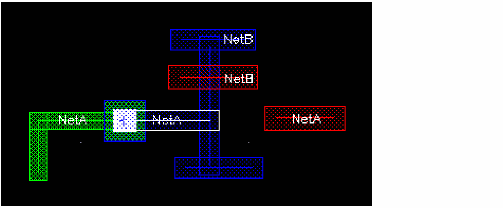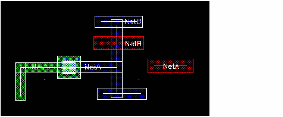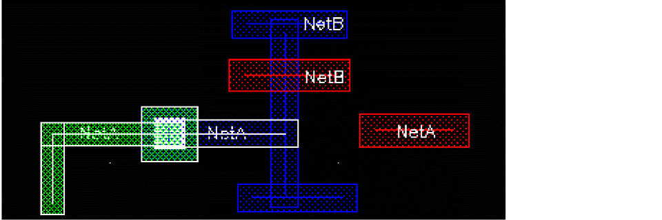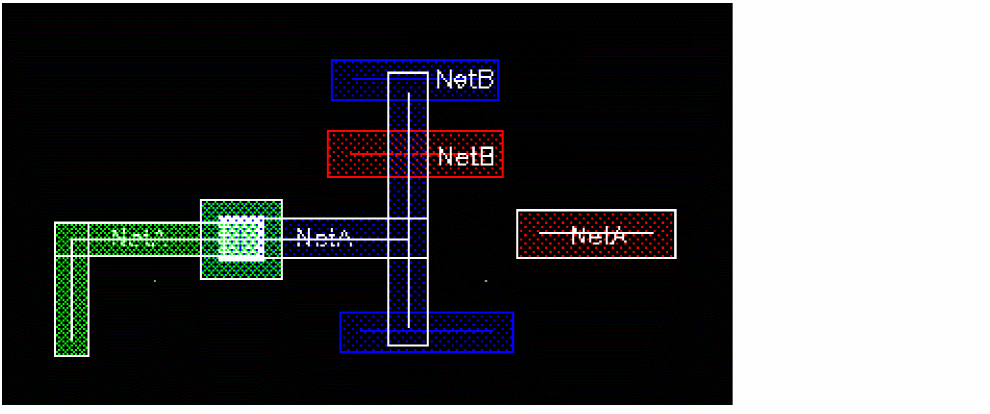 This is illustrated in the figure below. In the DRD Options form, the Enforce and Notify DRD modes are selected. The blue wire is a geometric wire created on neta. If you try to create a symbolic wire on netb, represented by the red wire in the figure below, the blue geometric wire is dimmed.