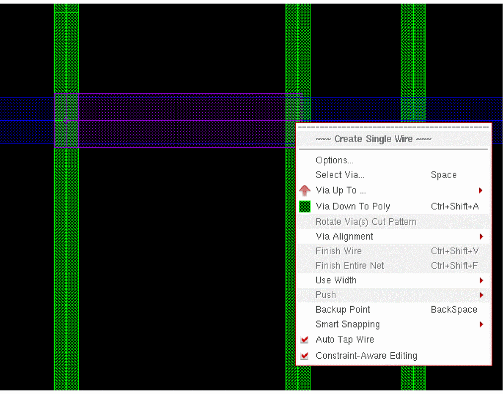 You drag the LiPO wire to the right, it overlaps both the Metal1 wire and the target PO wire. The automatically added via then disappears since Wire Editor cannot make an arbitrary choice between the two target layers. Therefore, in order to complete the connection to the PO wire, right-click and select Via Down to PO in the context-sensitive menu.