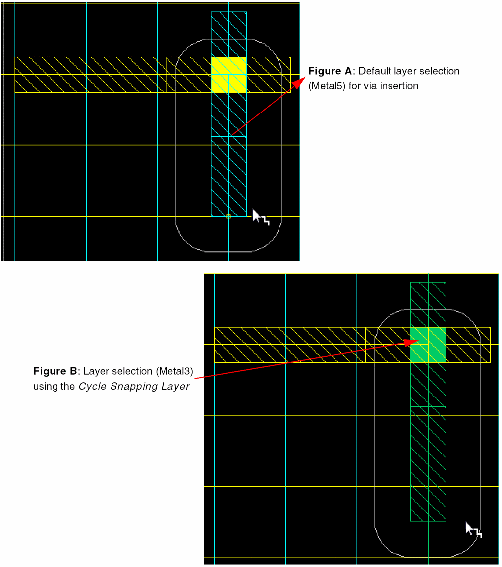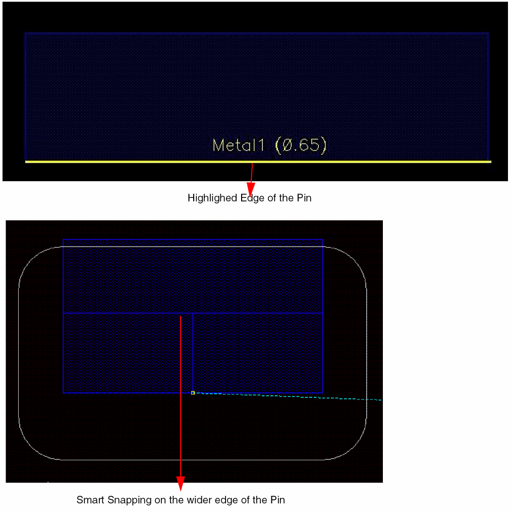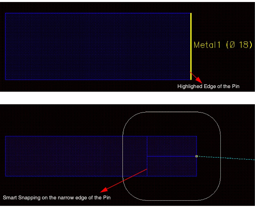 The following figure shows a Metal1_Metal2 via and displays smart snapping on the Metal1 layer of the via.