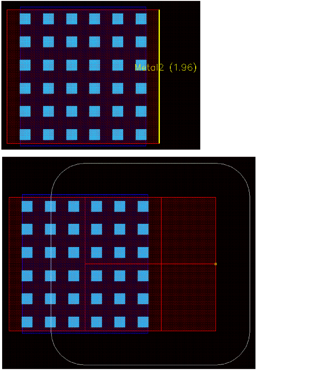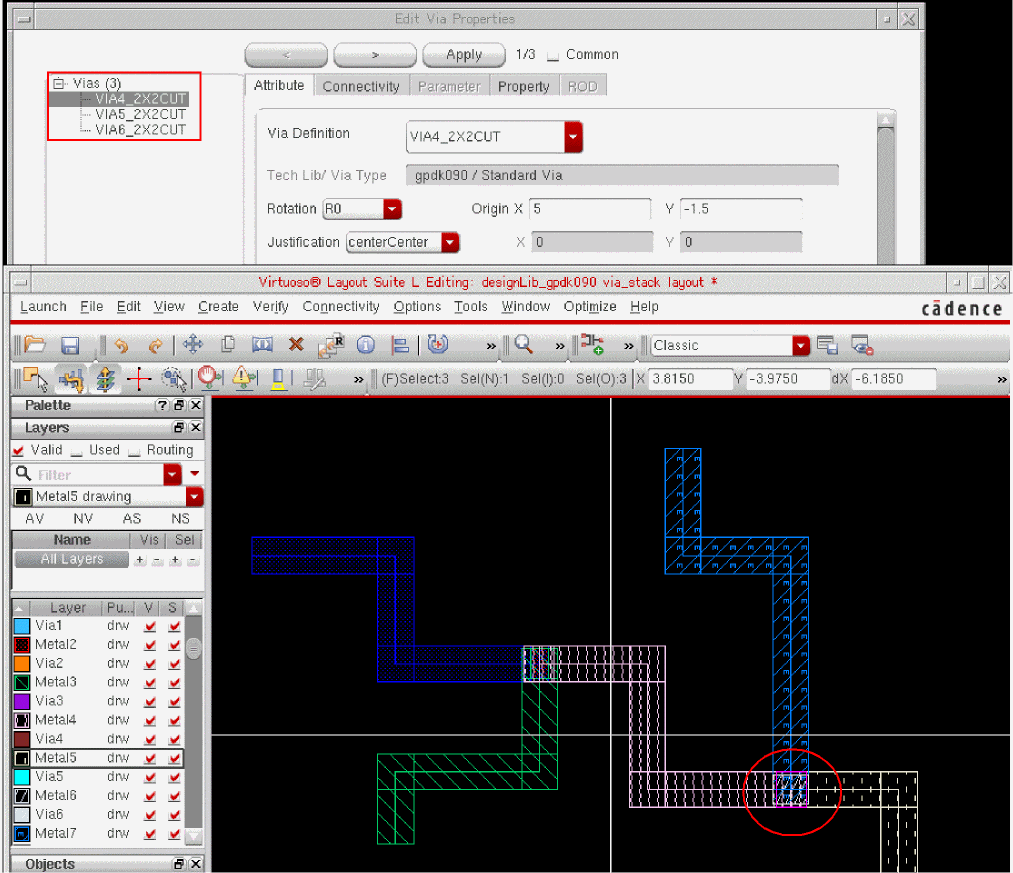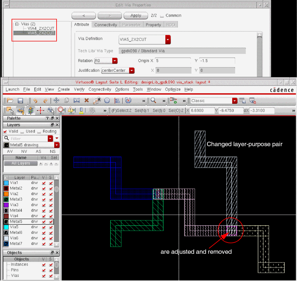 ThestandardViaDefshas a unique name and is associated with two layers and a list of via parameters with default values. It is a predefined device, generated based upon the value of its parameters. When creating wide wires, standard vias support via arrays. Rows and columns of vias are placed based on the area of metal overlap. Standard vias also allow you to edit the cut pattern of via arrays.