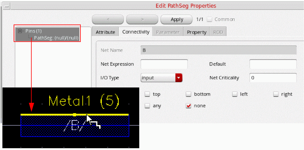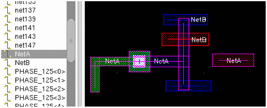 In the Net mode, a net in the current edited cellview can be selected by clicking on any pin of an instance that is hierarchically connected to it.
