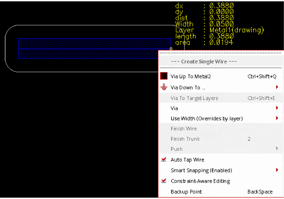 Right-click on the wire being created and select Via up to Metal2 from the Create Wire context-sensitive menu.