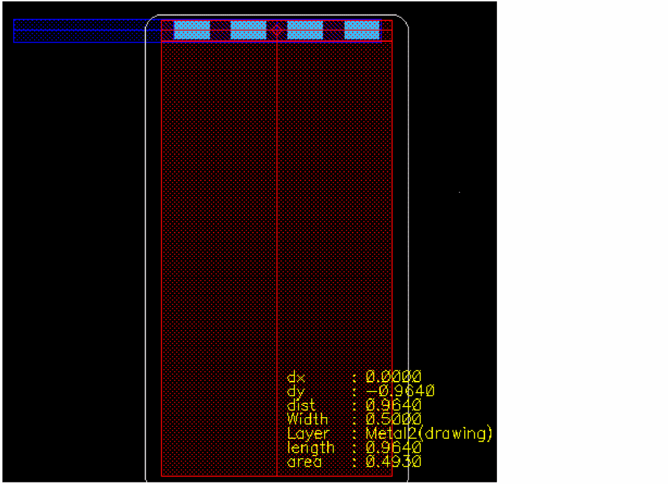 0.5in the Width field of the Create Wire form. The Create Wire form is displayed when you press theF3key. The area includes the placed via and wire ofMetal2.