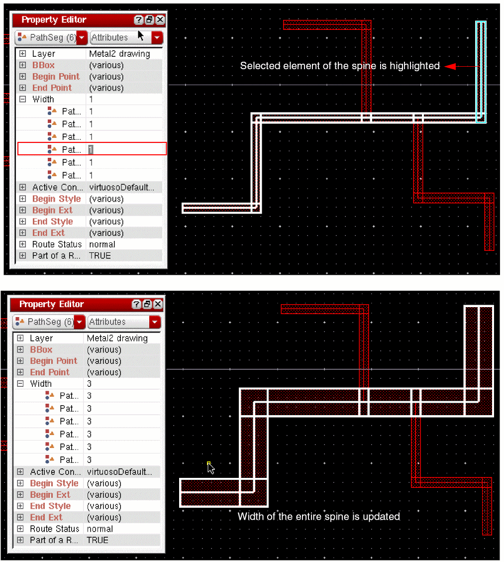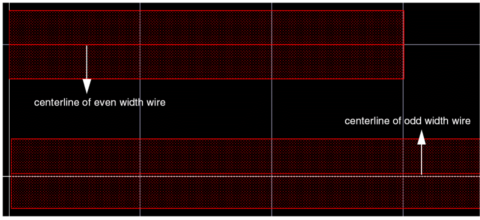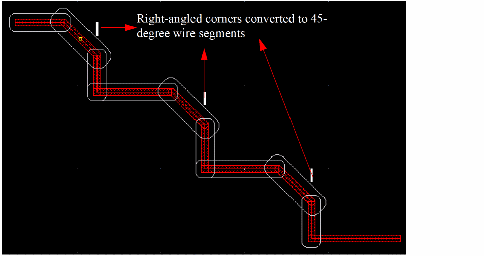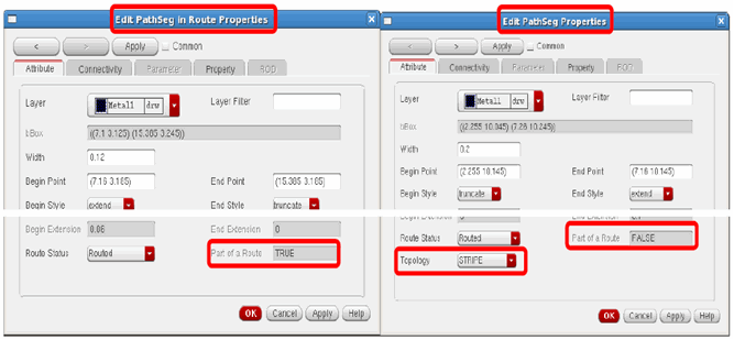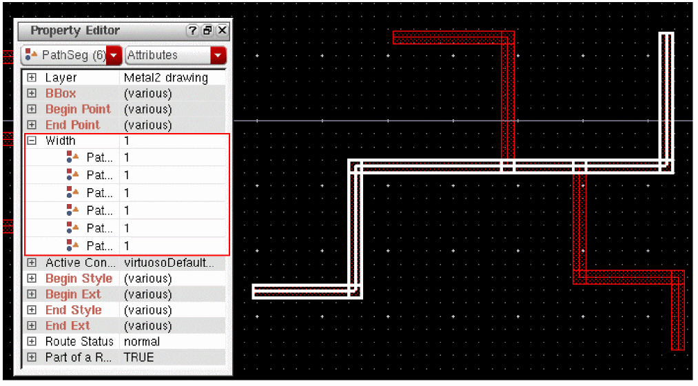 Geometric wires are created using paths, pathSegs, and vias that are not contained within a route. Paths cannot be placed in routes, therefore, paths are always geometric data. Geometric wires can be created in Virtuoso Layout Suite. Geometric wires are usually used for special routing (power, ground, clock, and so on), which is not the default for creating wires in Virtuoso. Geometric wires can be used to create custom interconnect that auto signal routers do not modify when re-routing, ripping-up, and pushing wires. The autorouter does not create, delete, or re-route geometric data but it may connect to geometric data. You can convert Geometric Wires to Symbolic Wires by using Edit – Wiring – Decompose Trunks.