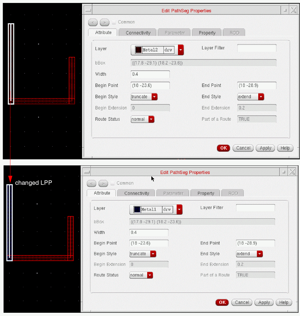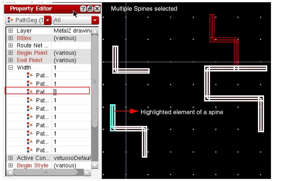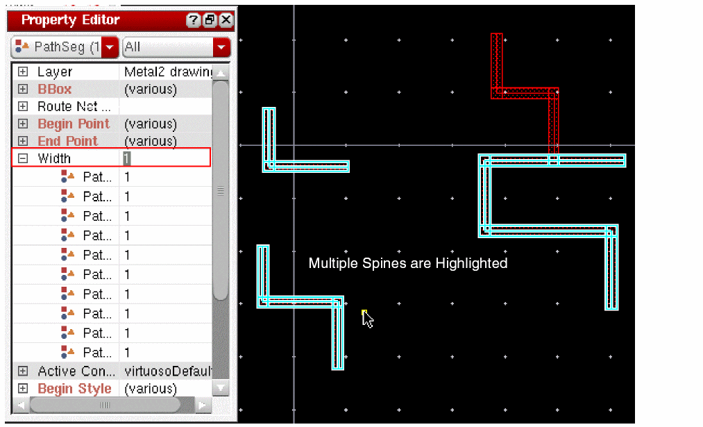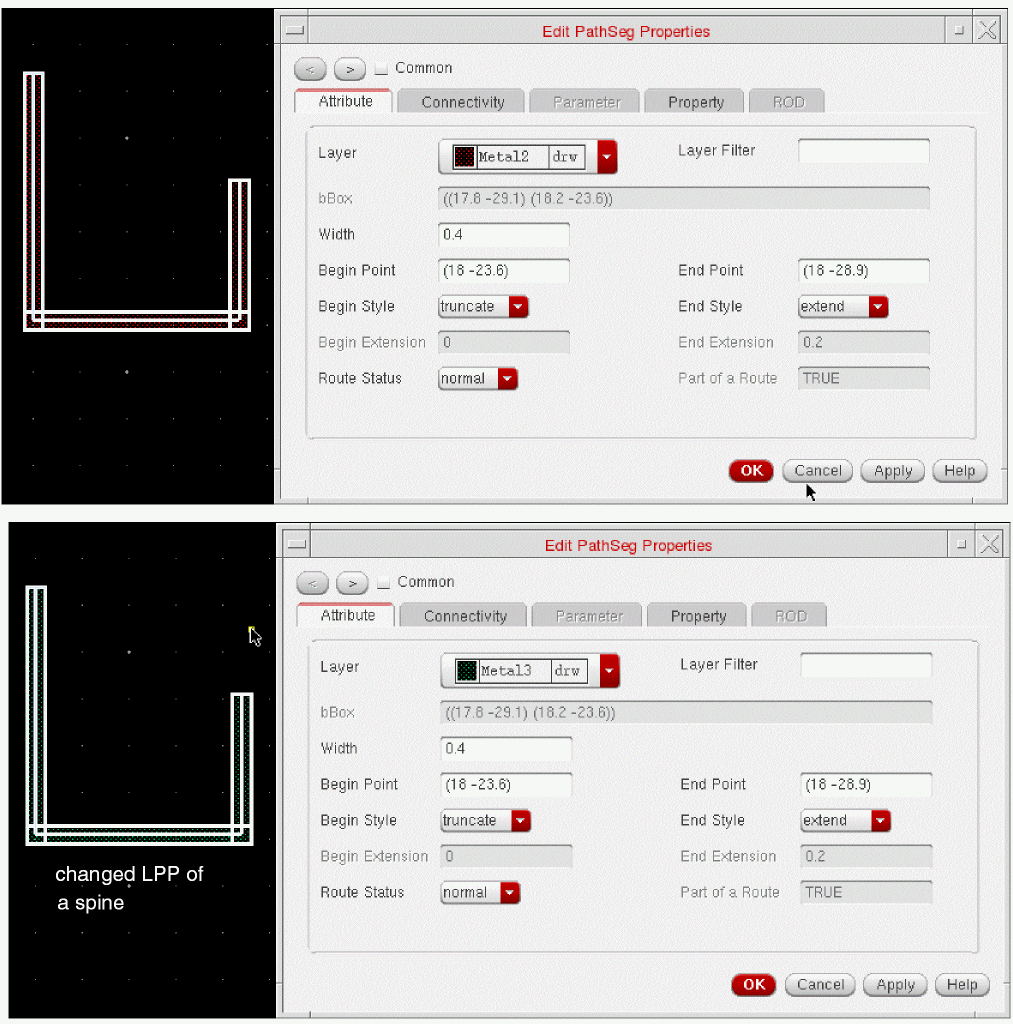 Geometric wires are created using paths, pathSegs, and vias that are not contained within a route. Paths cannot be placed in routes, therefore, paths are always geometric data. Geometric wires can be created in Virtuoso Layout Suite. Geometric wires are usually used for special routing (power, ground, clock, and so on), which is not the default for creating wires in Virtuoso. Geometric wires can be used to create custom interconnect that auto signal routers do not modify when re-routing, ripping-up, and pushing wires. The autorouter does not create, delete, or re-route geometric data but it may connect to geometric data. You can convert Geometric Wires to Symbolic Wires by using Edit – Wiring – Decompose Trunks.