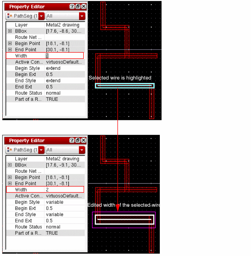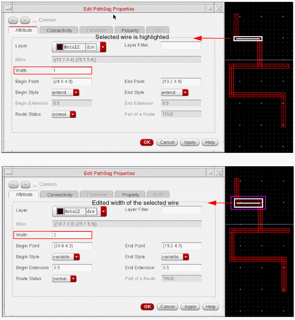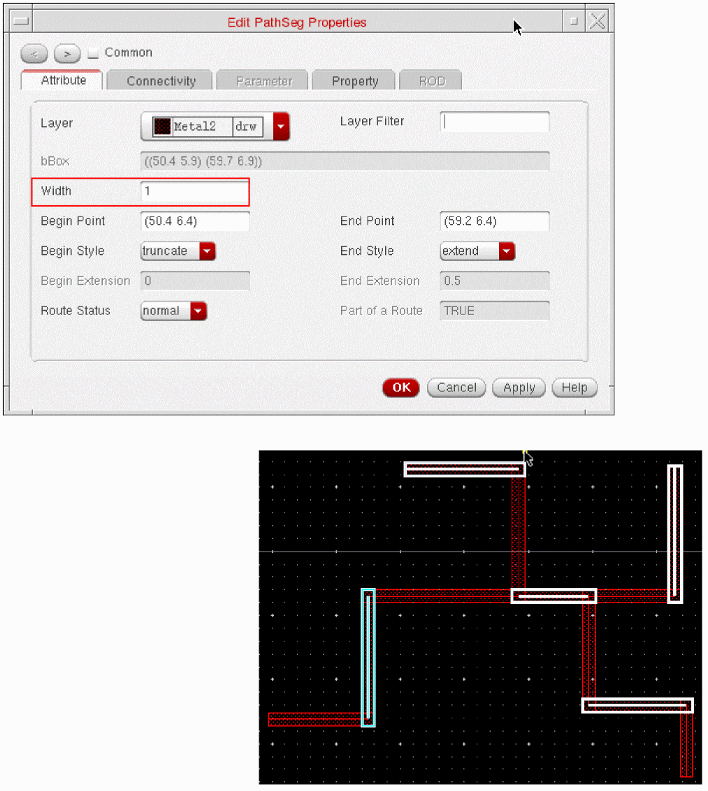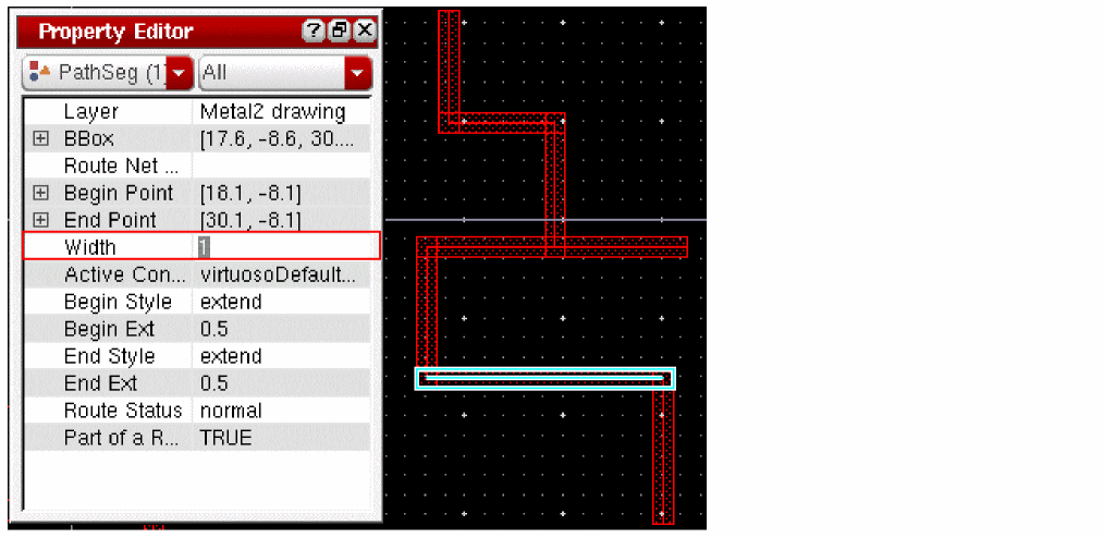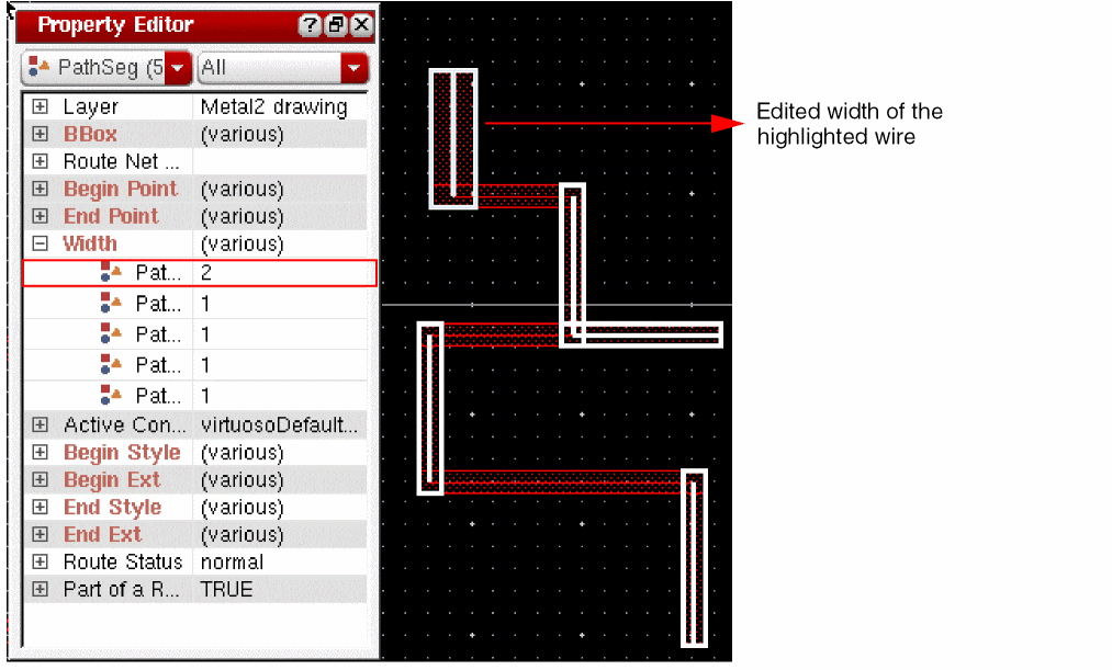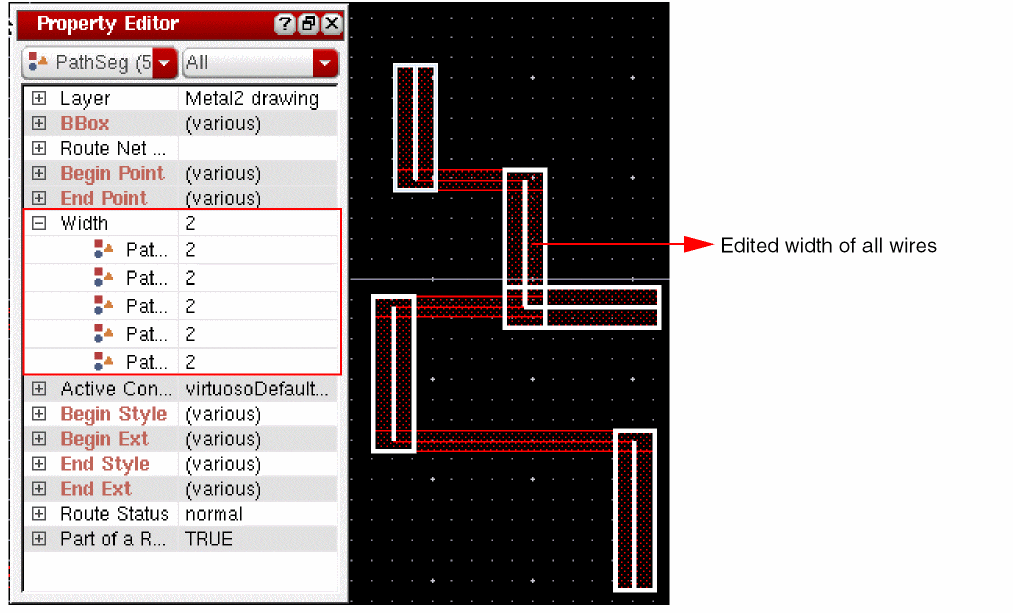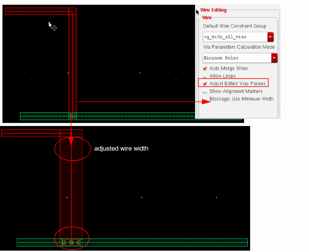 When tapping a wire, if the Tap Attributes option in the Layout Editor Options form is on, the width of the new wire is determined from the width of the wire being tapped, provided it is compliant with the minWidth and maxWidth constraints.