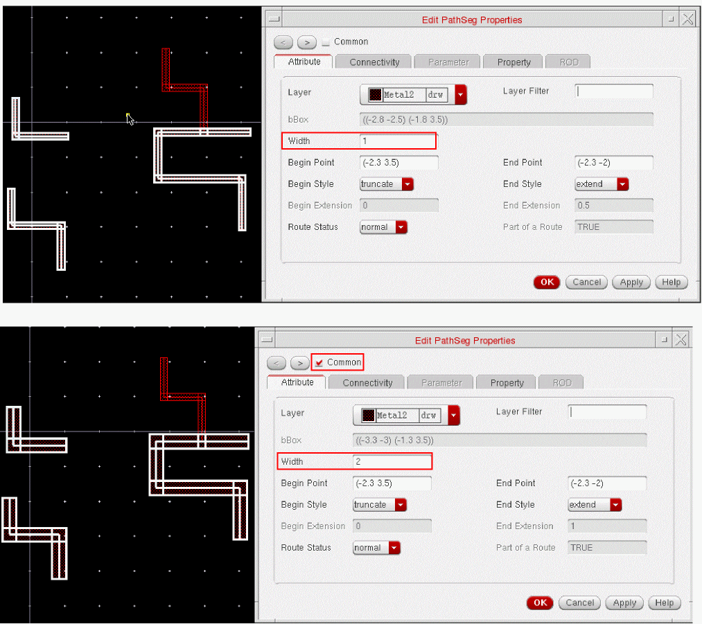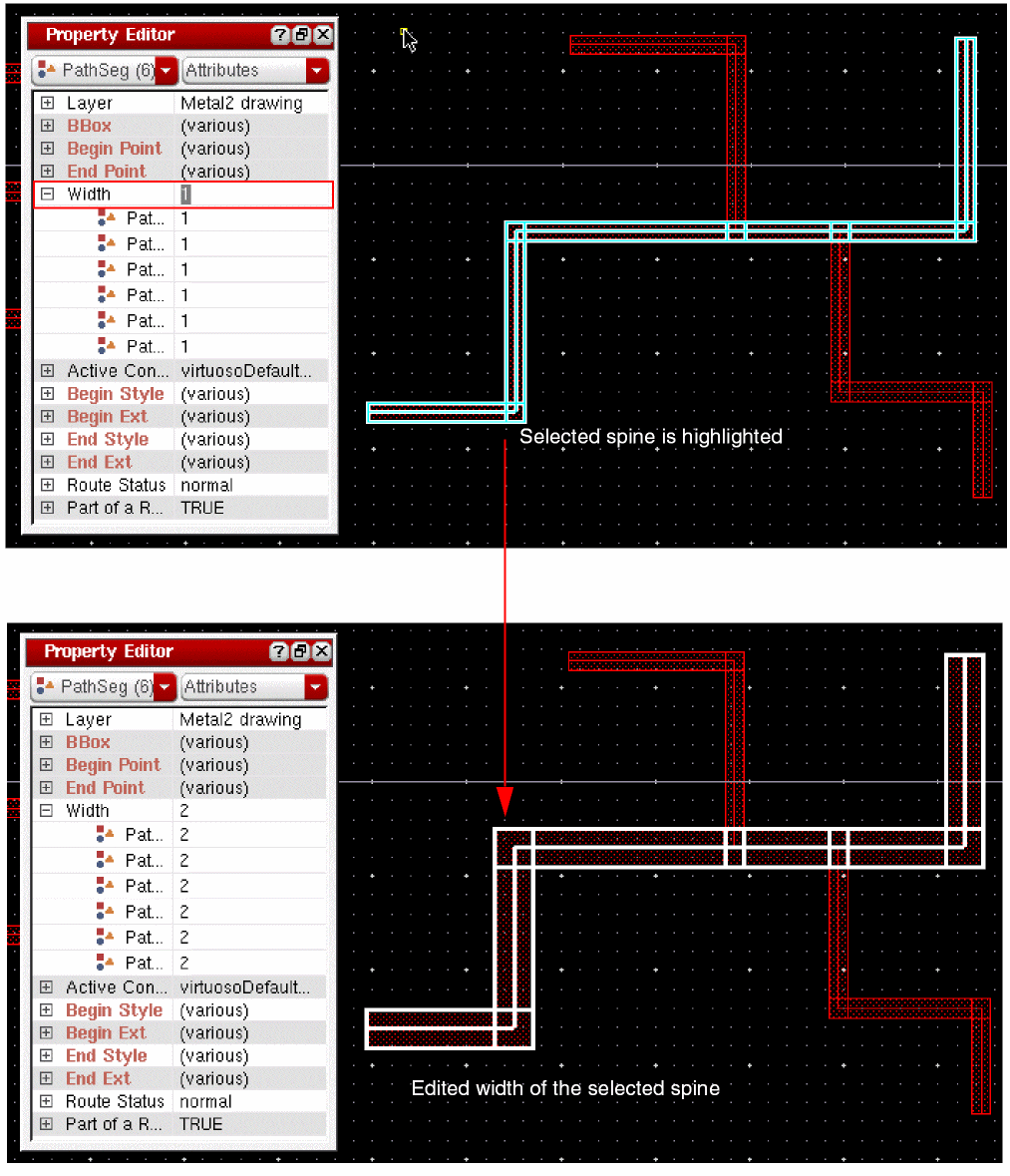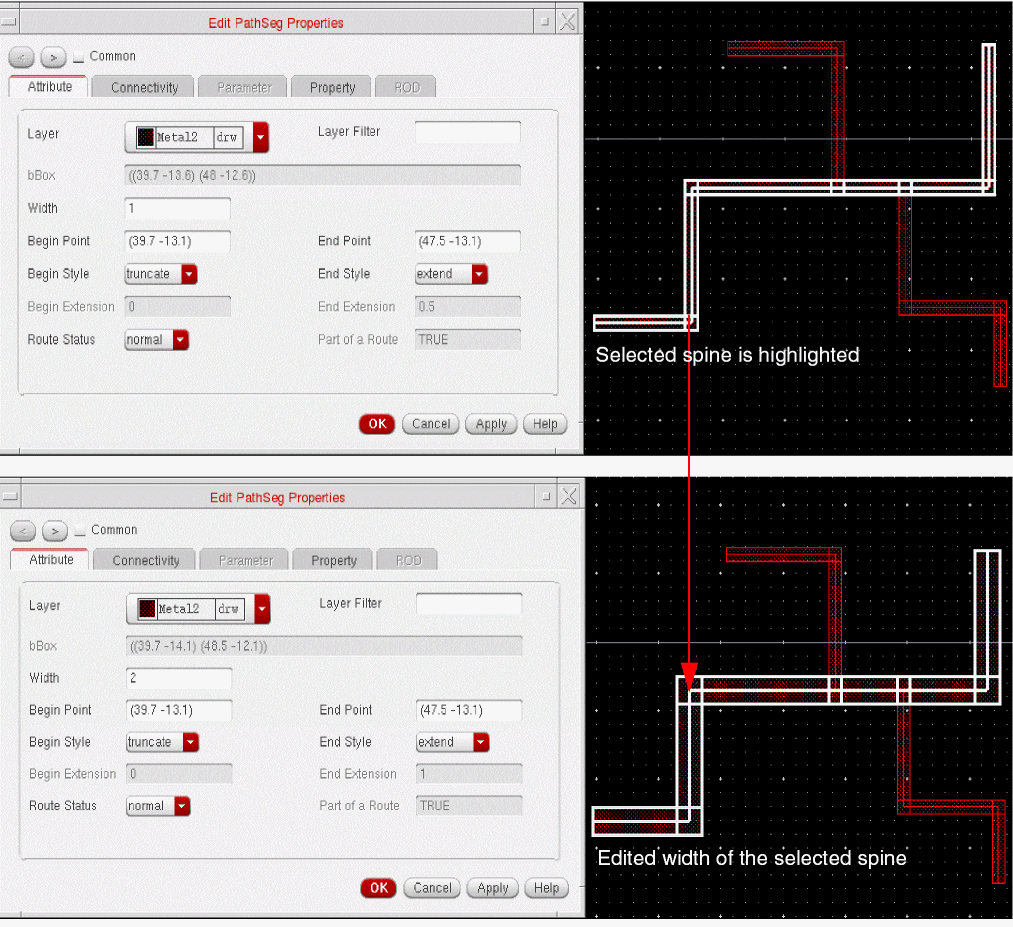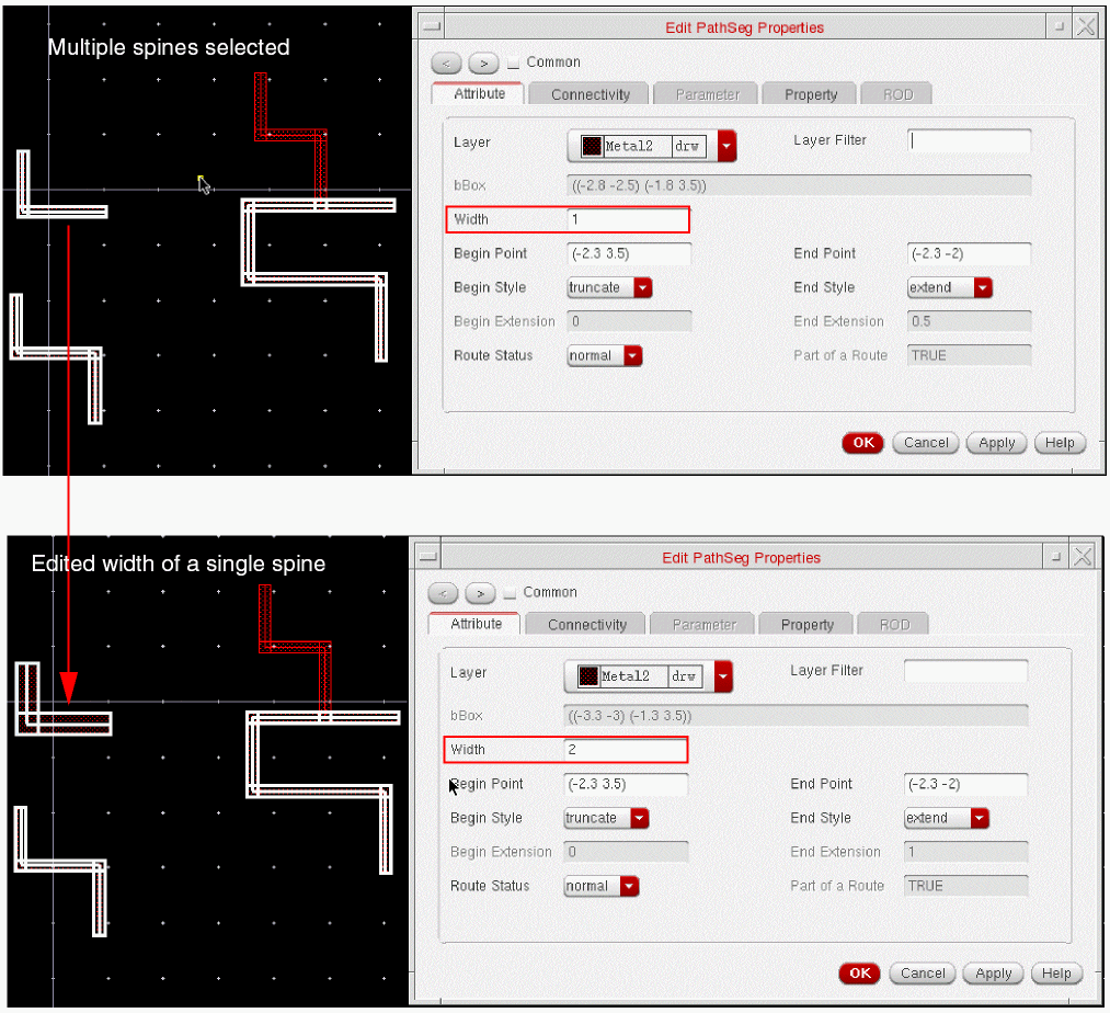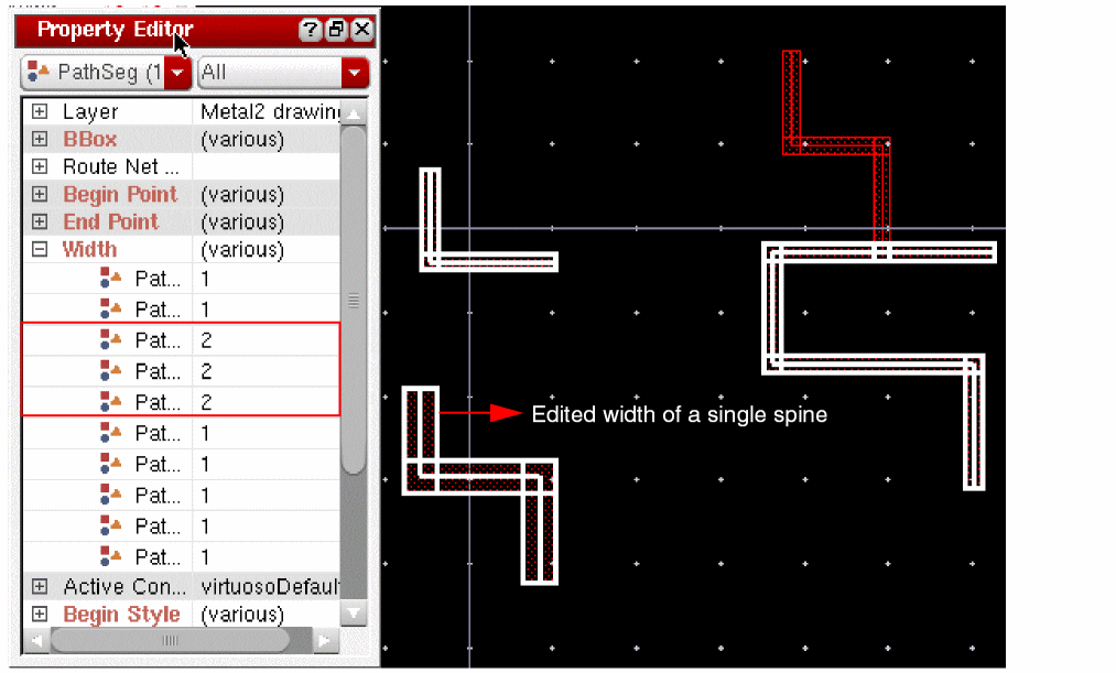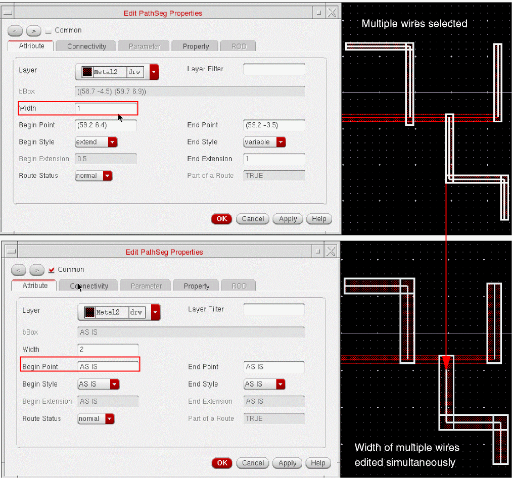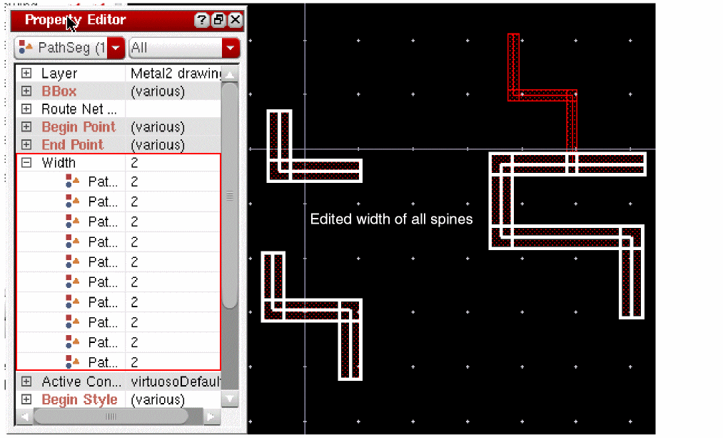 When tapping a wire, if the Tap Attributes option in the Layout Editor Options form is on, the width of the new wire is determined from the width of the wire being tapped, provided it is compliant with the minWidth and maxWidth constraints.