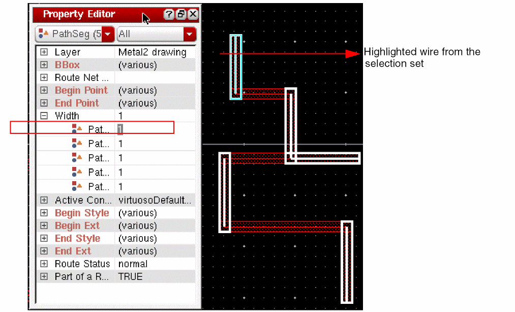 Symbolic wires are created using pathSegs and vias that are contained within routes. Routes are internal containers used by the system to group pathSegs and vias. They are usually attached to nets and can have default constraint groups assigned. In Virtuoso, symbolic wires can be created by using the Create – Wiring – Wire or the Create – Wiring – Bus command in all tiers of Layout Suite. Symbolic wires are typically used for signal routing, which is the default for creating wires in Virtuoso. The Virtuoso Space-based router only creates well-formed symbolic wires with matching end points.