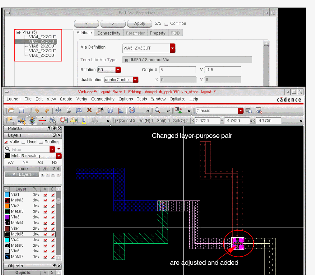 ThecdsGenViawith purposefillis inserted between theMetal1andMetal2layers.