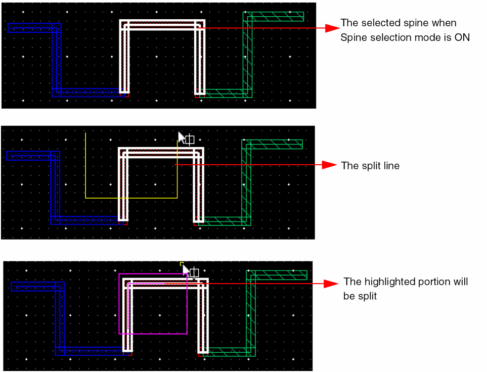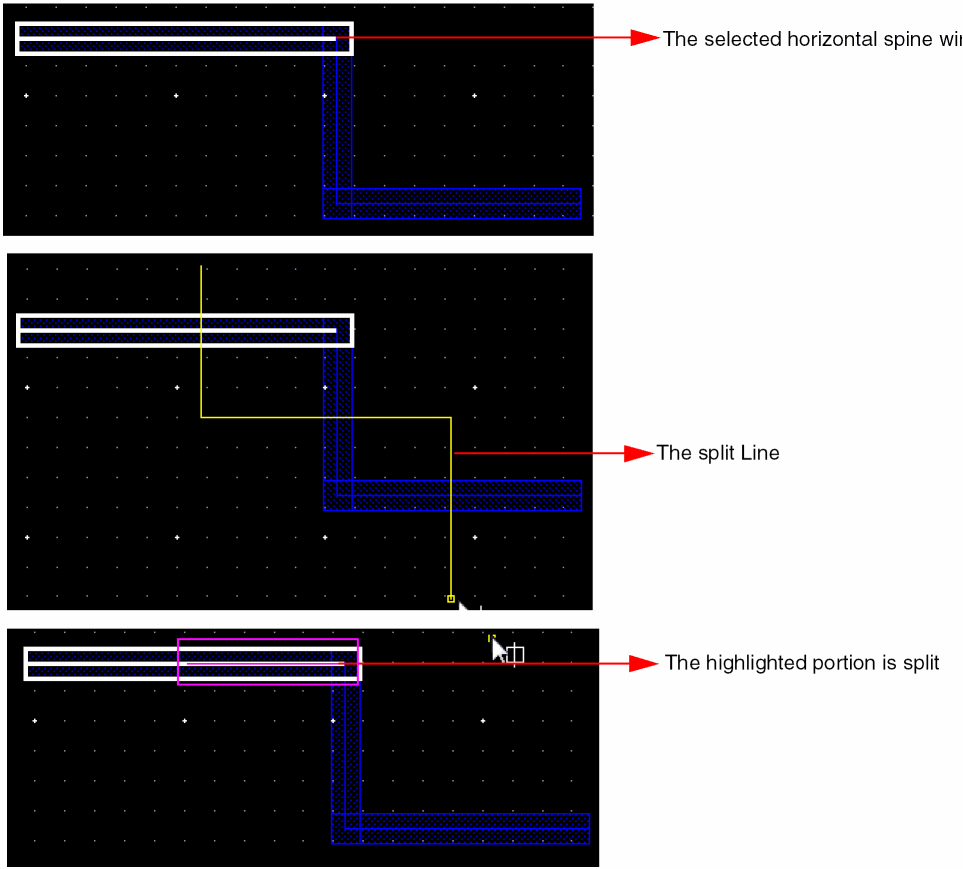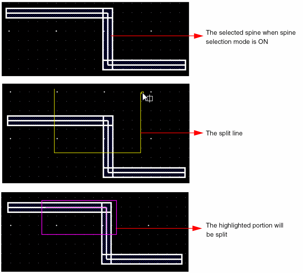 The following figures illustrate how a spine is split when the horizontal spine wire is not selected as a part of a split line.