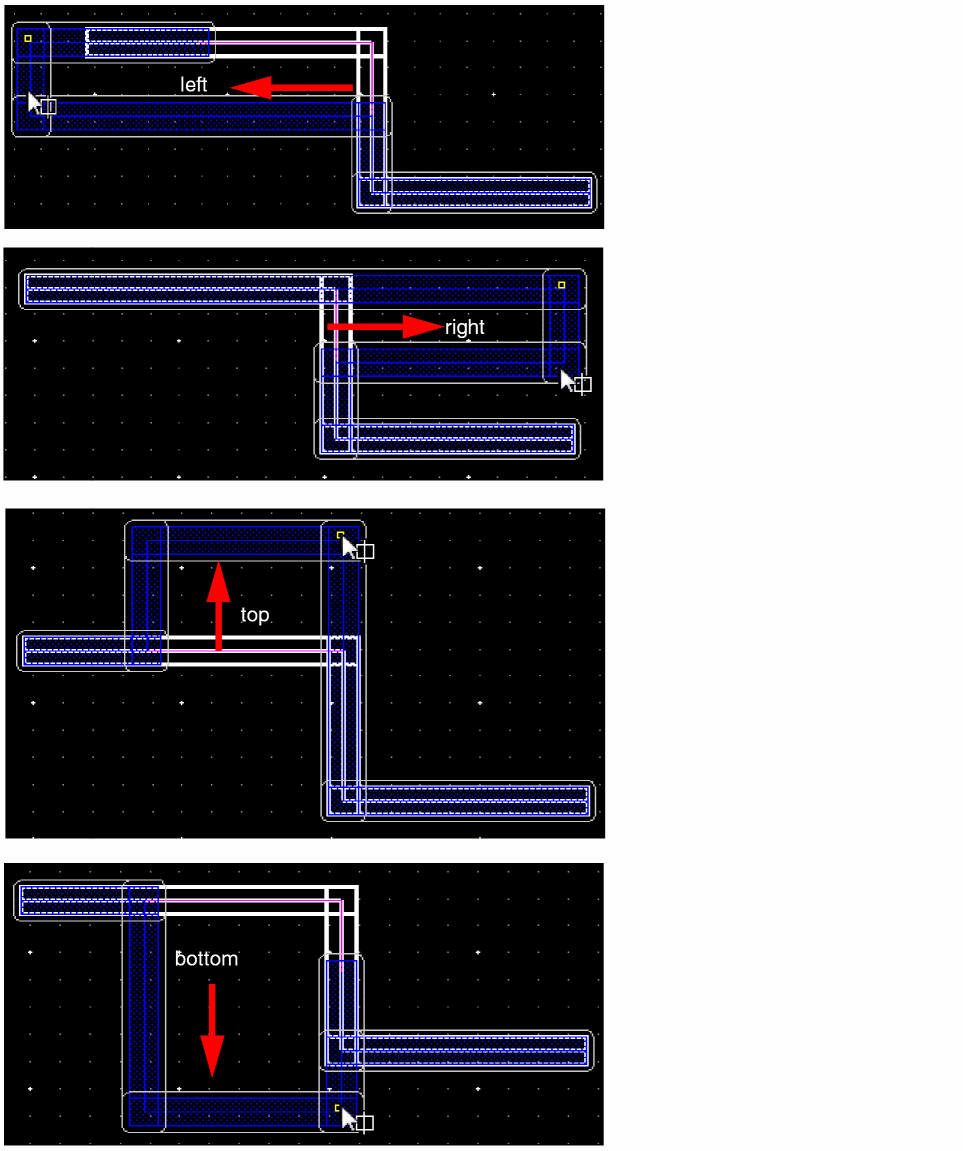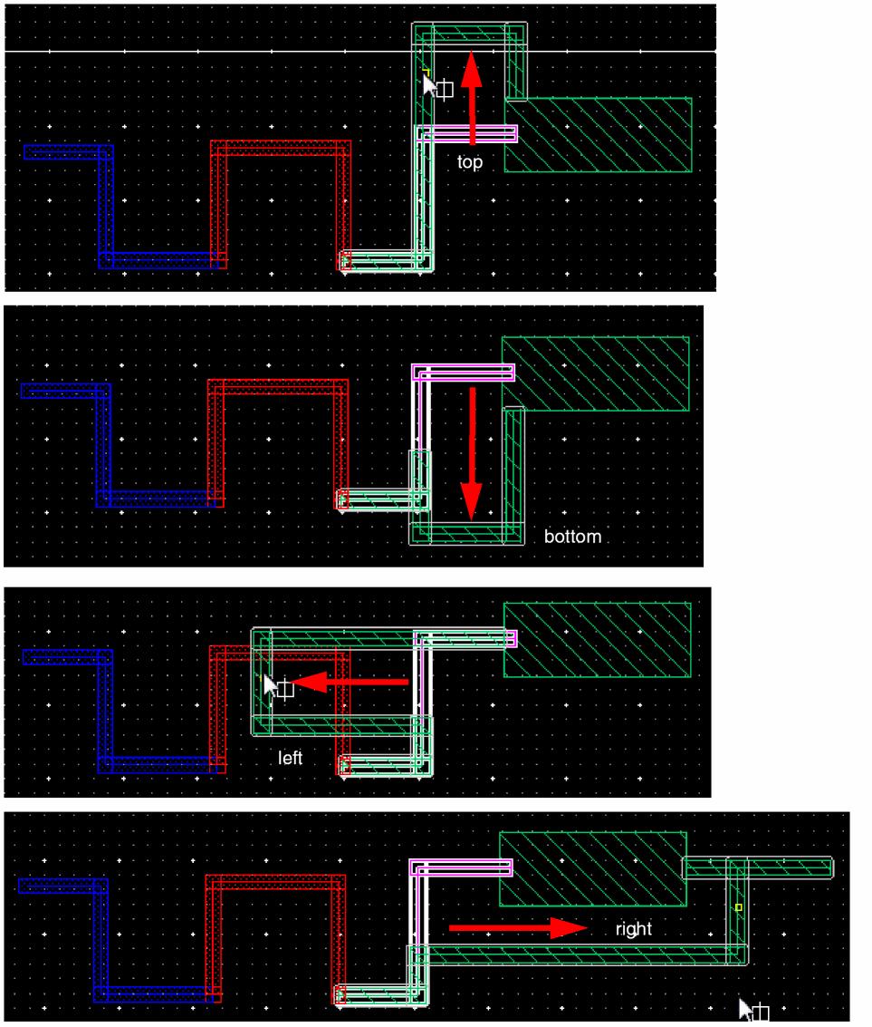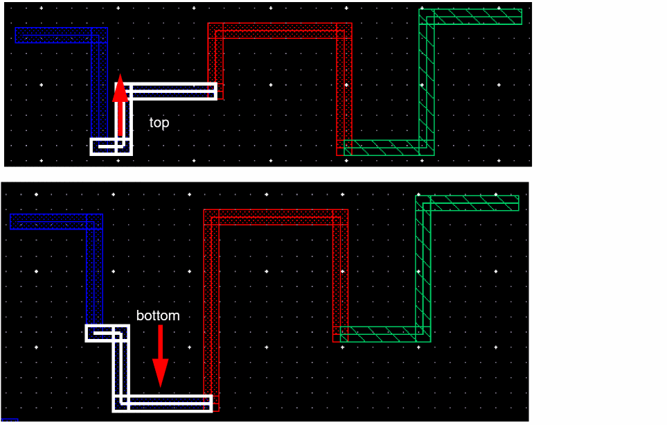 The wire editor follows a centerline connectivity model, defined in OpenAccess, which requires a physical via to be used when transitioning between layers, so even though the technology does not require a via, the tools connectivity model does. This is a cumbersome use model and unnecessarily adds extra steps as far as local interconnect layers are concerned. In order to make the Li use model more intuitive for the layout designer, the Wire Editor use model has been enhanced to automatically generate and place the required vias when transitioning to and from the Li layers. This would help you to automatically add vias when connecting Li layers. You only need to know the layer on which you want to draw the wire, the layer from which the wires are coming from, and the layer to which they are going. The various Li wiring use models are described below.