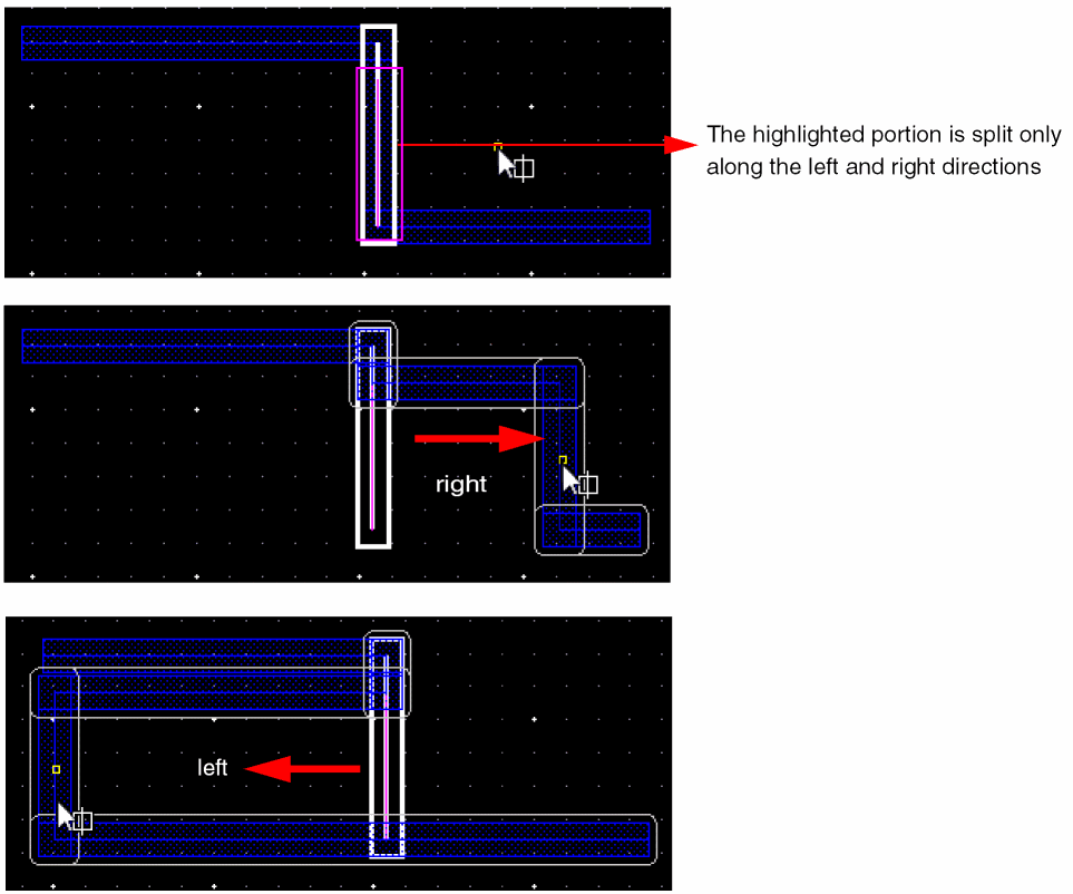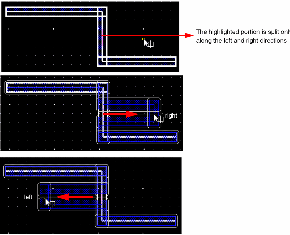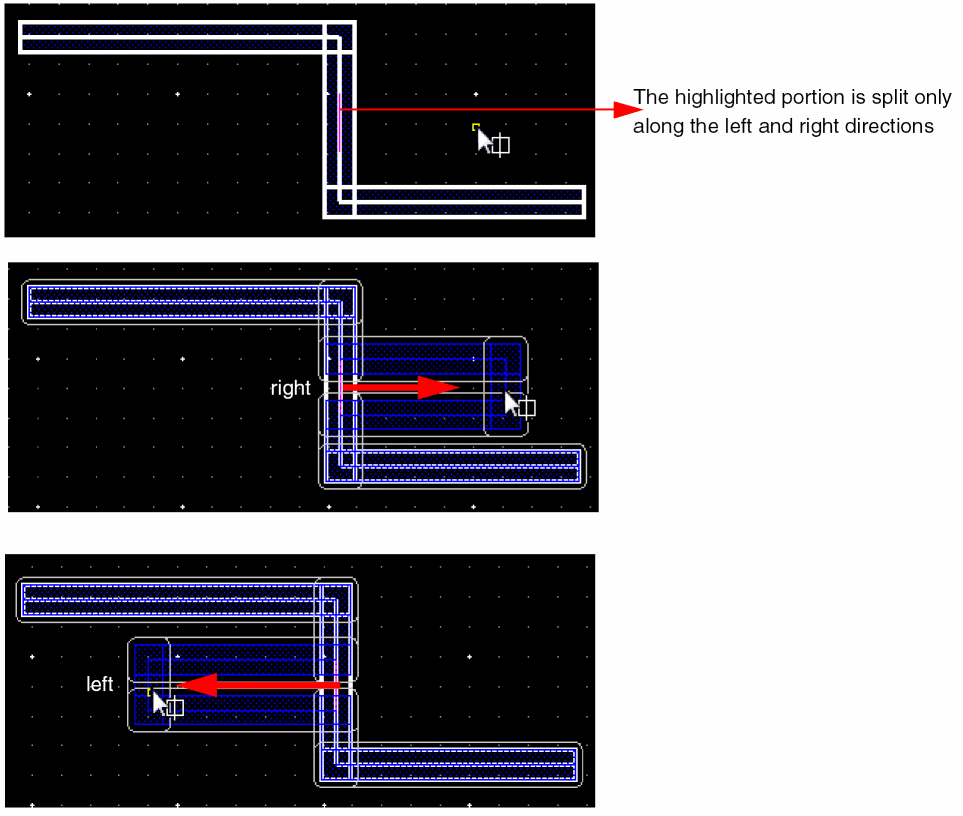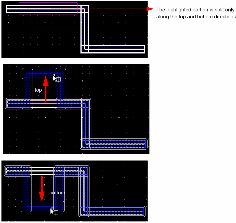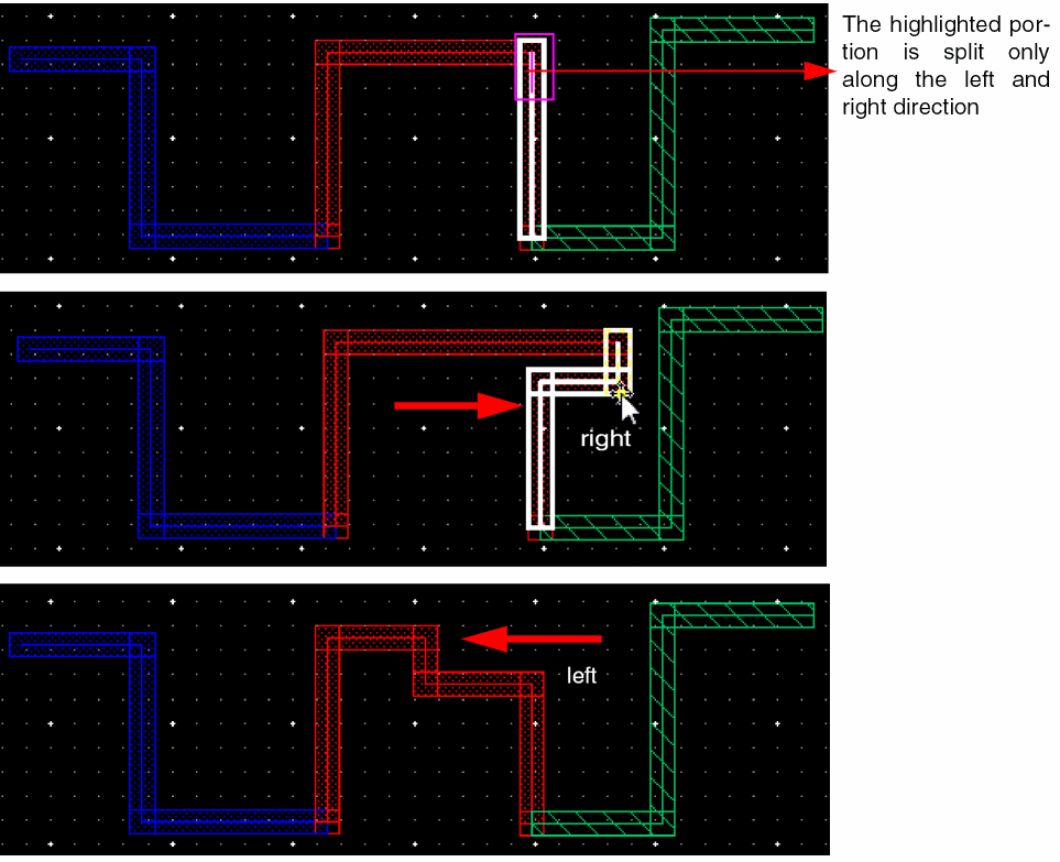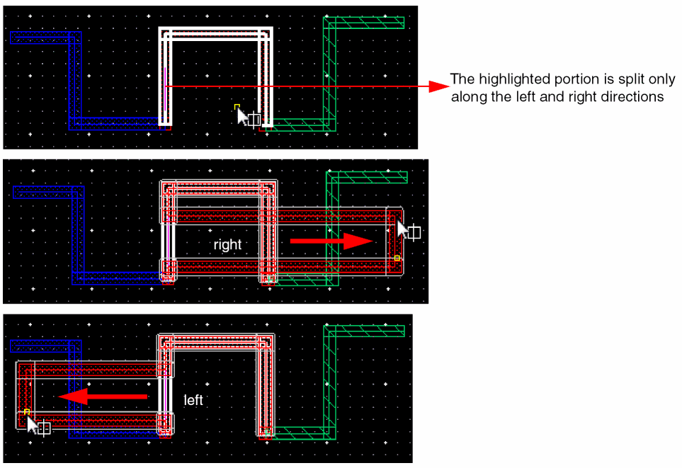 The following figures illustrate the splitting and stretching when a horizontal spine wire is selected.