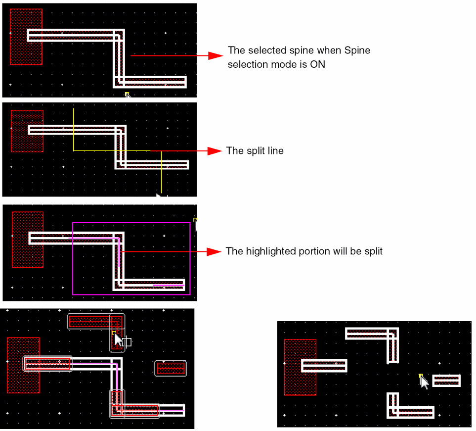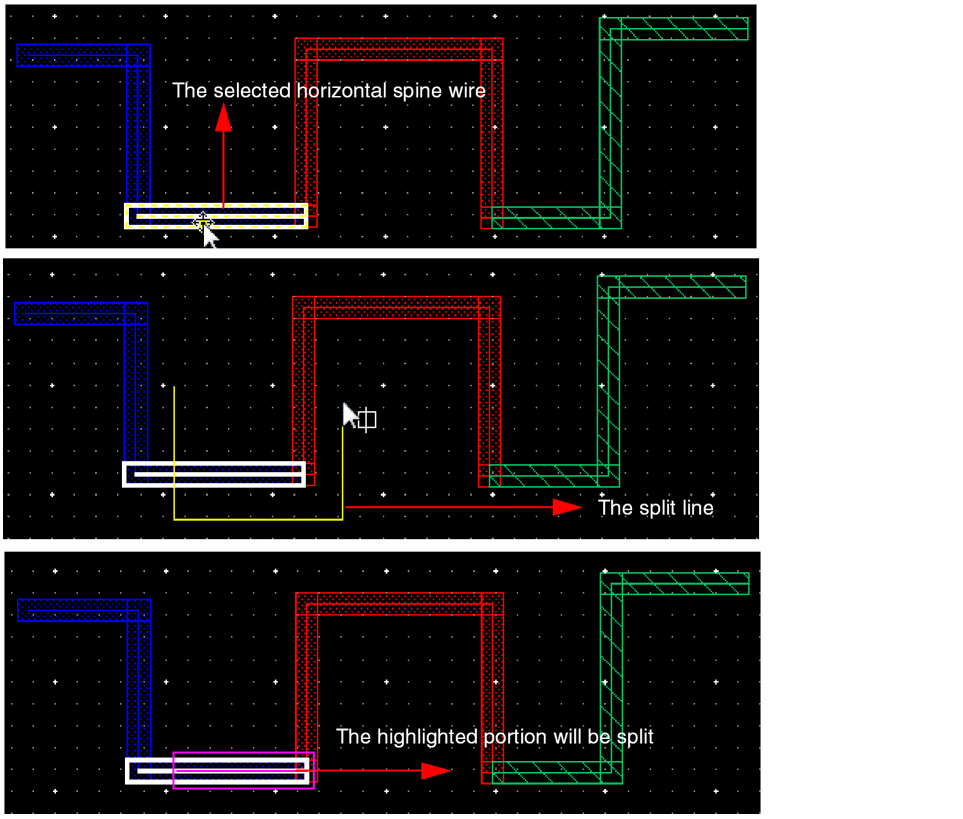 The following figures illustrate the splitting and stretching when a vertical spine wire is selected.