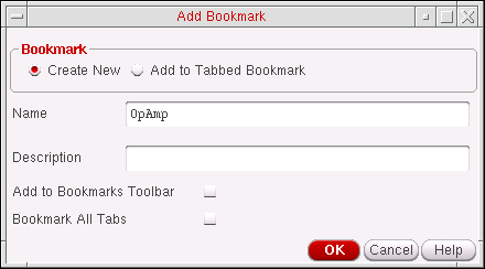 The name of the current design cellview appears in the Name field. You can also right-click over any existing session window tab, and select Add Bookmark to display the Add Bookmark form.