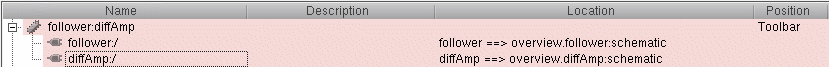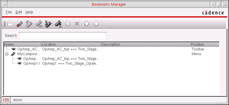 If you expand a composite bookmark before making your selections, be aware that each selected line in the Bookmarks Manager window counts as a selected item (up and down movement is restricted within the composite bookmark itself). The program opens each selected item in its own session window. For example, if you expand a composite bookmark containing two cellviews and select all three lines in the Bookmarks Manager window like this:when you choose File – Open, three session windows appear: