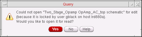 If you attempt to open a cellview that is already being used (that is, the cellview file is locked by another user), a warning message gets displayed informing you of the current user of the cellview and the current host machine name.