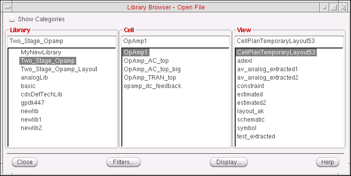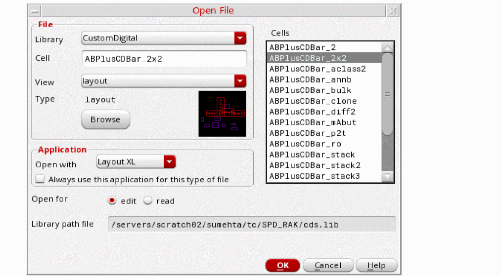 To open the file in edit mode, you must have write permission to the file. - If you chose File – Open in a session window, you can select one of the Open in radio buttons to indicate how you want the program to open the cellview.