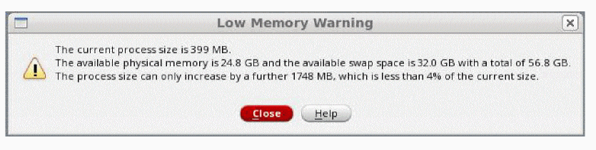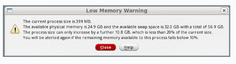 When available system memory reduces so that it reaches or crosses the highest or the middle memory warning thresholds, or both, the following warning dialog is displayed: