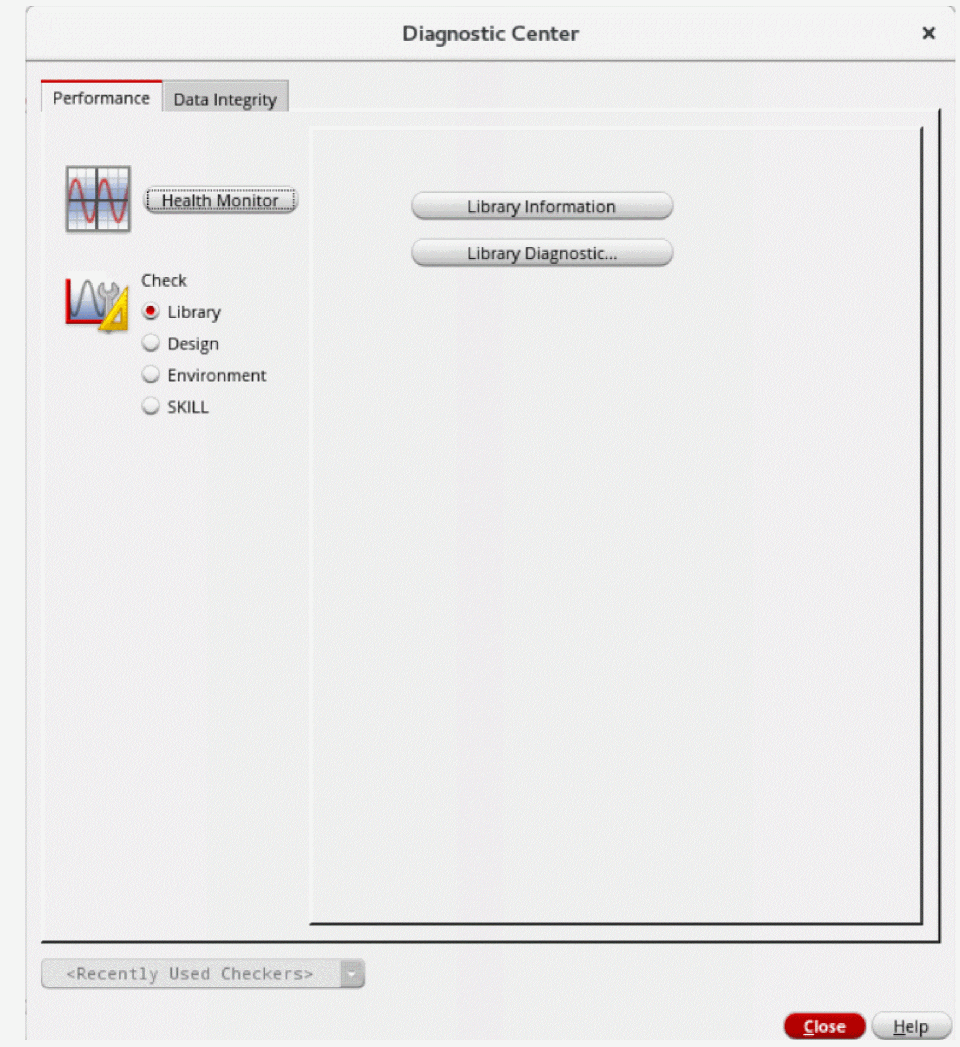 - The Performance tab has the Health Monitor, which provides information to help you set up Virtuoso for better performance. This tab offers multiple checks to detect potential setup issues, such as checking environment variables, library data, design statistics, and SKILL profiling.