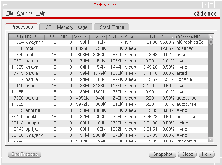 In the Task Viewer, you can view the Processes that are currently being run to determine which processes are going to impact the performance analysis results, and also the CPU_Memory Usage, X Resources, and the Stack Trace.