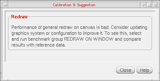 To run the Calibrator tool, you need not select any specific benchmark tests from the Benchmark table. You can monitor the progress of the calibration tests in the Testing window while the tests are being run. After the calibration is complete, the results are displayed in the Calibration & Suggestion window. The Calibration & Suggestion window provides general test analysis results, along with suggestions on how to improve system performance in relation to graphics.