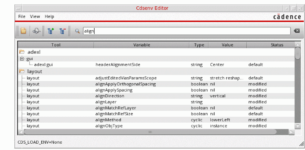 If an environment variable value is modified in the Cdsenv Editor, the variable row gets highlighted in blue. However, the color stays black if the value is modified using the SKILL command envSetVal in the CIW. Environment variable values are synced between Virtuoso and the Cdsenv Editor. Value changes using one tool are instantly reflected on the other tool.