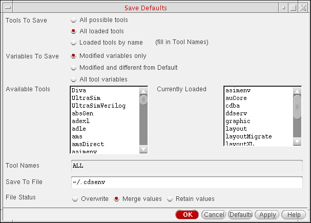 Some applications require you to save application-specific defaults in a file other than ~/.cdsenv. Those applications provide a command to load the defaults. For that information, see the documentation for the application.