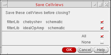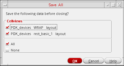 If you click Cancel, you cancel both save and exit operations. The program does not save your changes and does not exit.If you attempt to exit Virtuoso when there are more than 1632 modified cellviews, constraints, and techfiles, which are active in your session then you get prompted by the Save All form to choose All or None, without the list of modified data being displayed as it exceeds displayable limits.