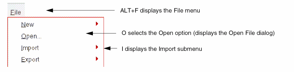 Menu access keys are displayed as underlined letters in the menu or menu item names. For example:
