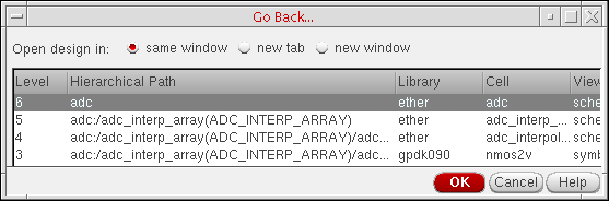 Use the Back drop-down icon to display a list of previously displayed cells/cellviews.