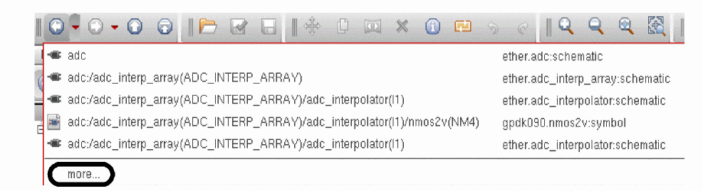 The maximum number of cellviews displayed at a time in the drop-down list is five. When the number of possible cellviews to go back to exceeds five, an additional more menu item appears on the drop-down list.