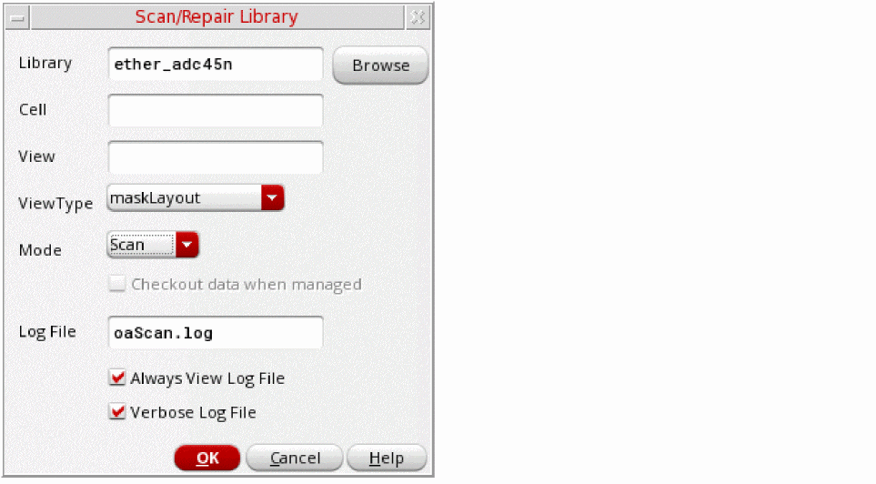 - Specify the name of the library to scan and, optionally, the cell and view names if you want to perform the scan on a particular design database.